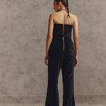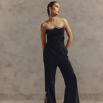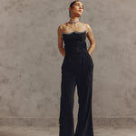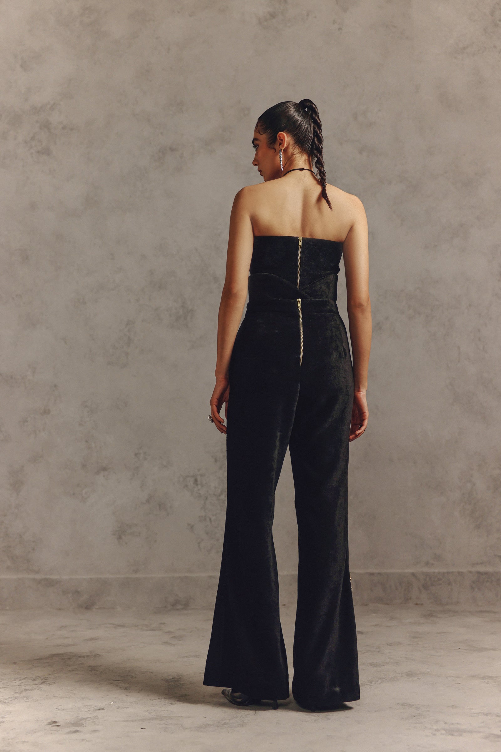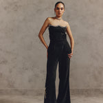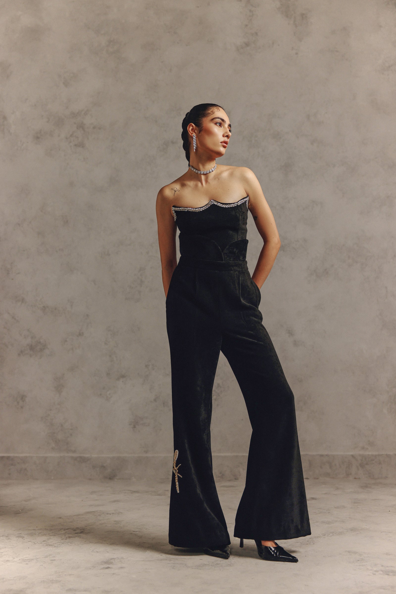 A black co-ord set crafted for a look that features a strapless top with a wavy, embellished neckline that offers a refined yet modern twist. The tailored high-waisted pants elongate the figure and are finished with a statement gold hand embroidered dragonfly at the lower leg, adding a flourish of quiet luxury. Sleek and artfully detailed, this ensemble transitions seamlessly from cocktail evenings to upscale gatherings.