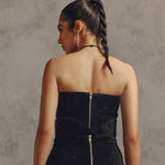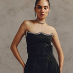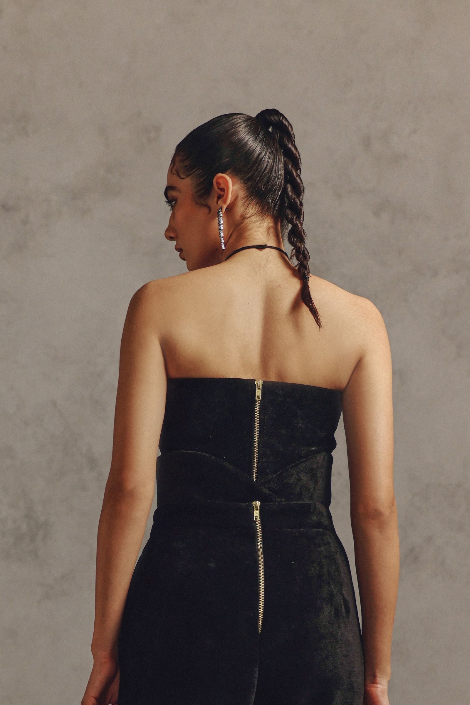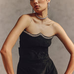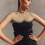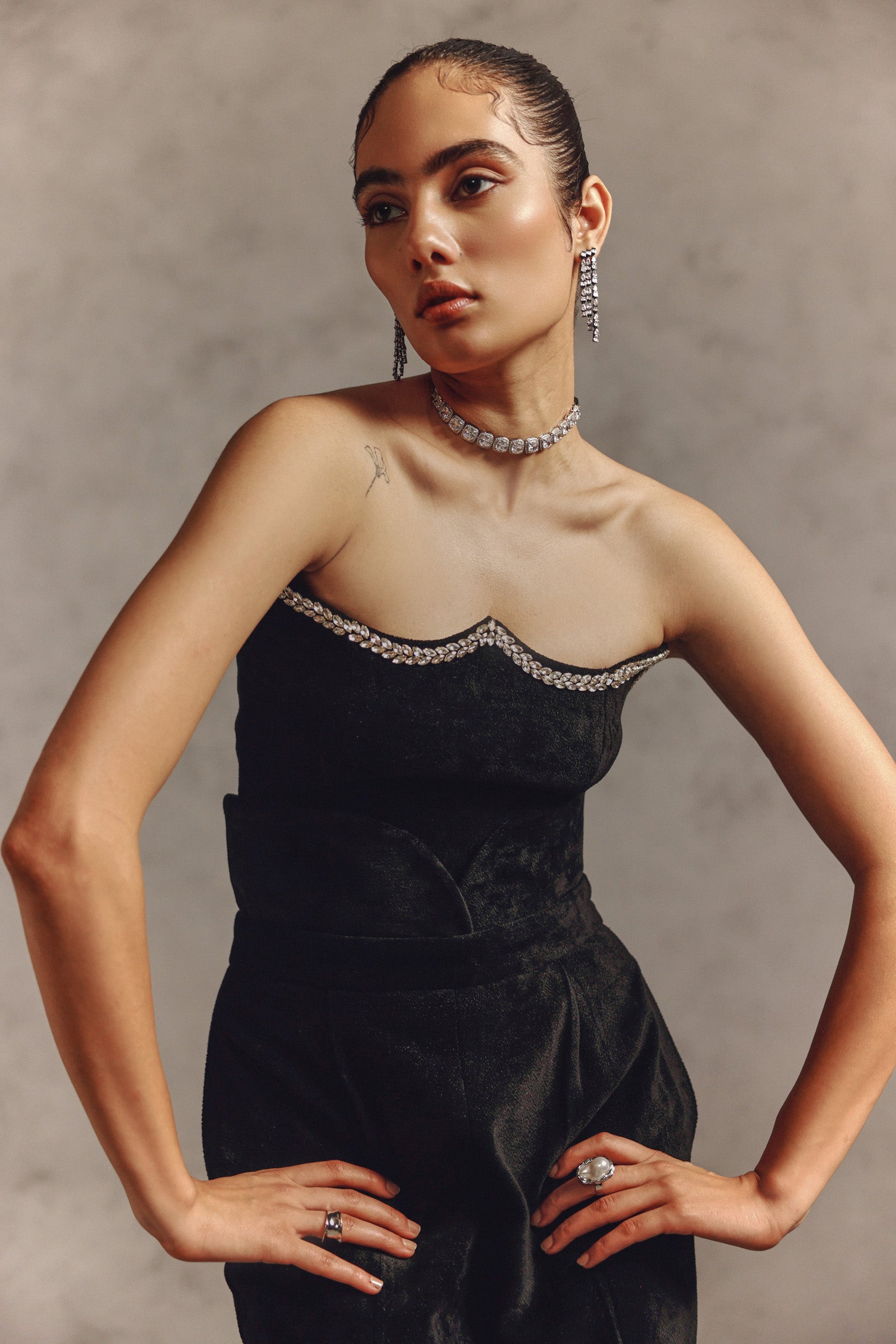 The top is a structured strapless velvet bustier in deep black. It features an ornate, glittering trim along the neckline. The fit includes this glamorous detail that elevates the classic corset style.