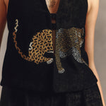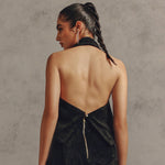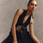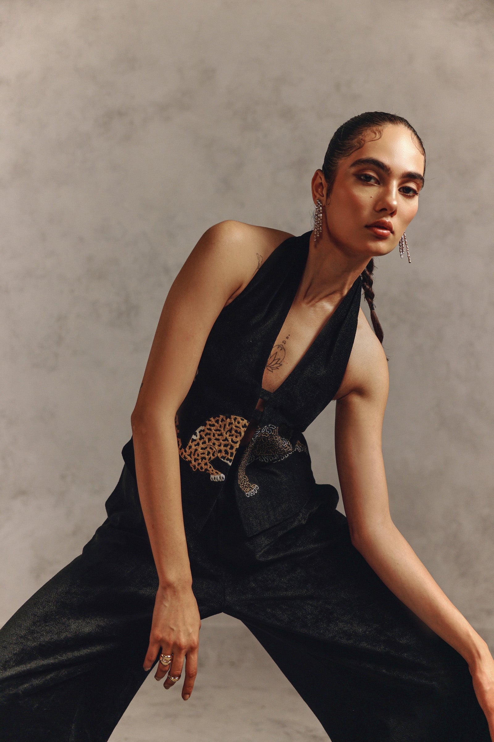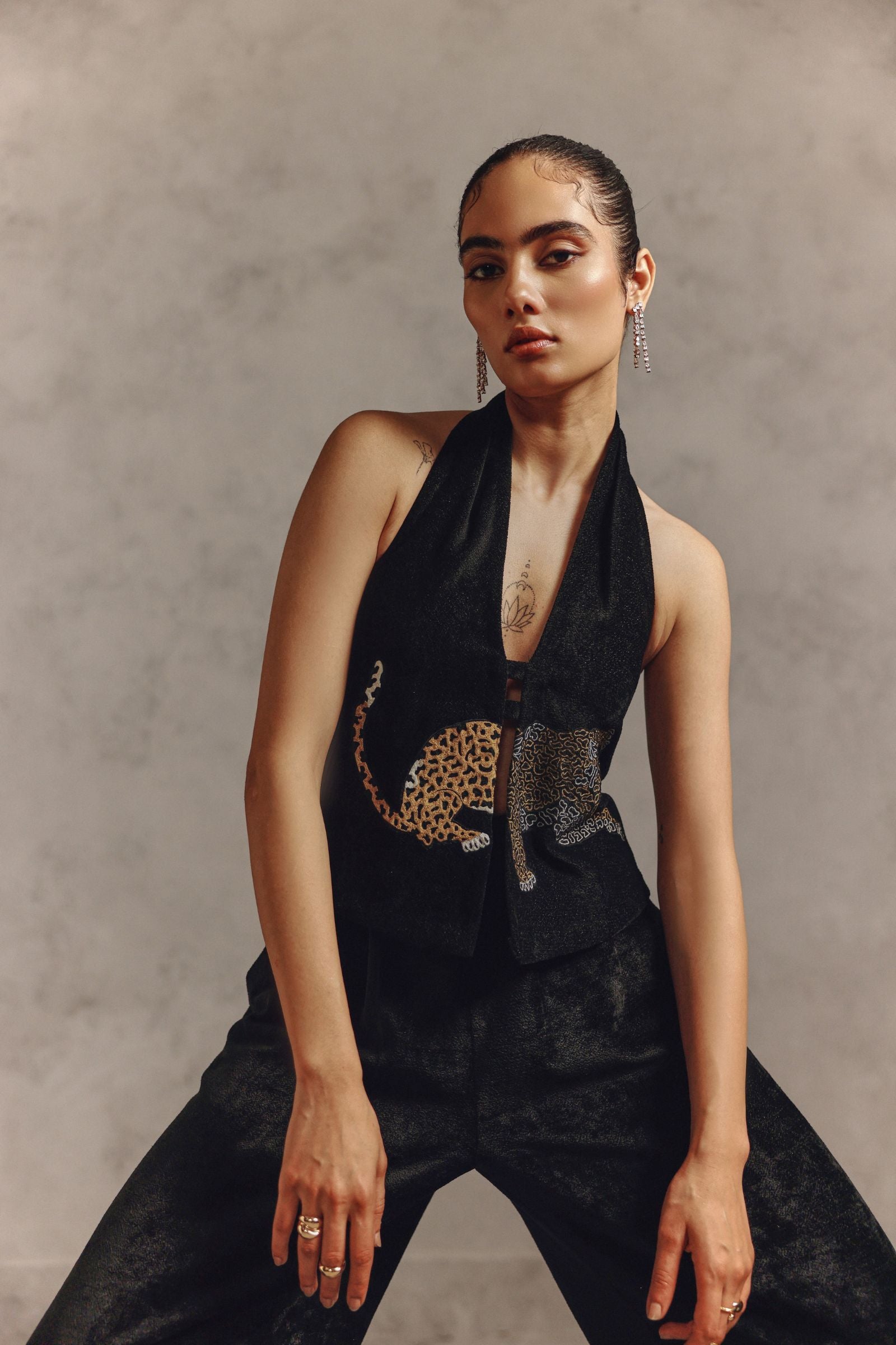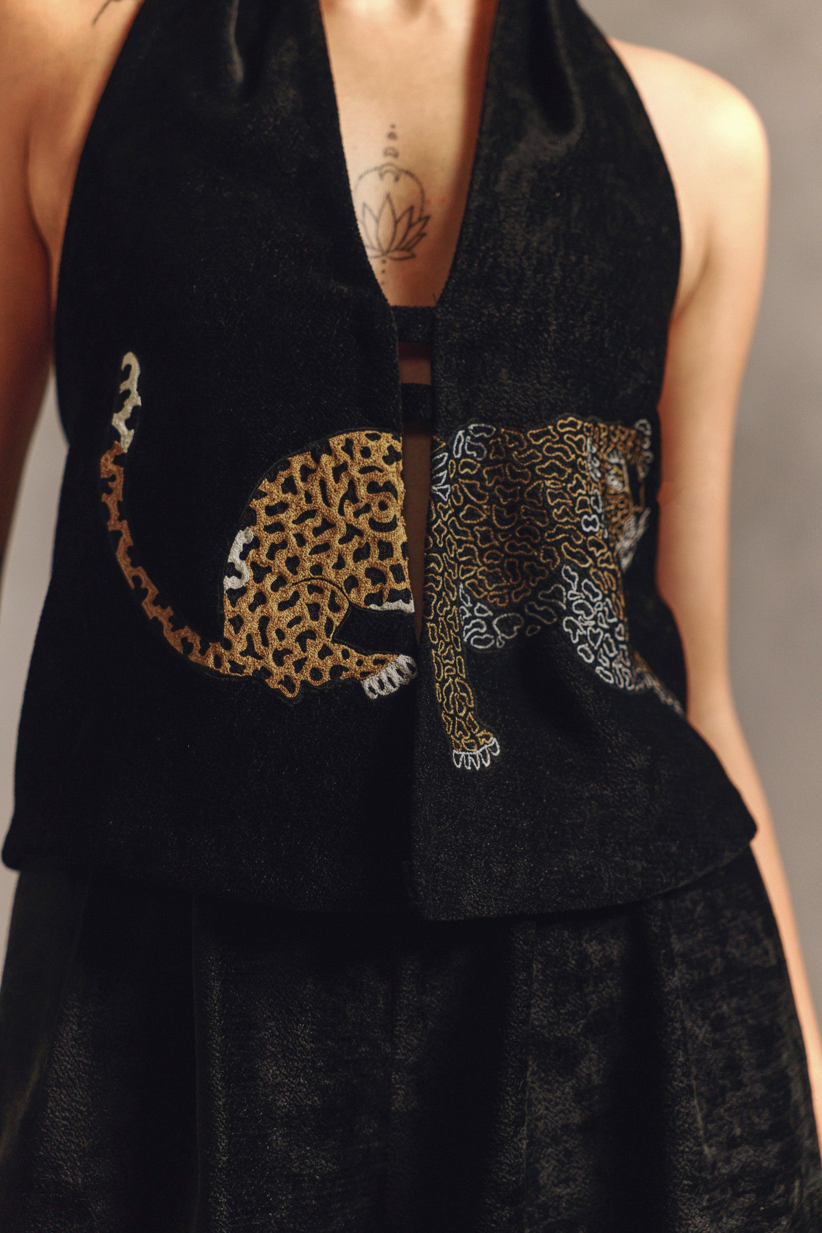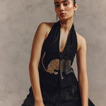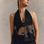 The halter-neck top is offers a luxurious, texture and a beautiful drape. Its sleek silhouette is elevated by a glimmering, hand-embroidered leopard across the front, adding fierce and standout visual. Structured to flatter, the top blends glamour with modern edge.