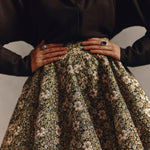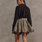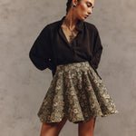 The mini skirt features a high waist and a sharply flared hemline, made striking by bold floral embroidery. Its structured shape delivers crisp definition, while the vivid pattern brings playful contrast and visual excitement to the ensemble.