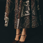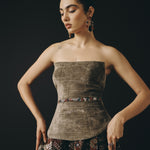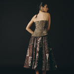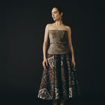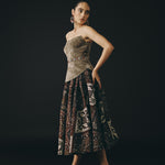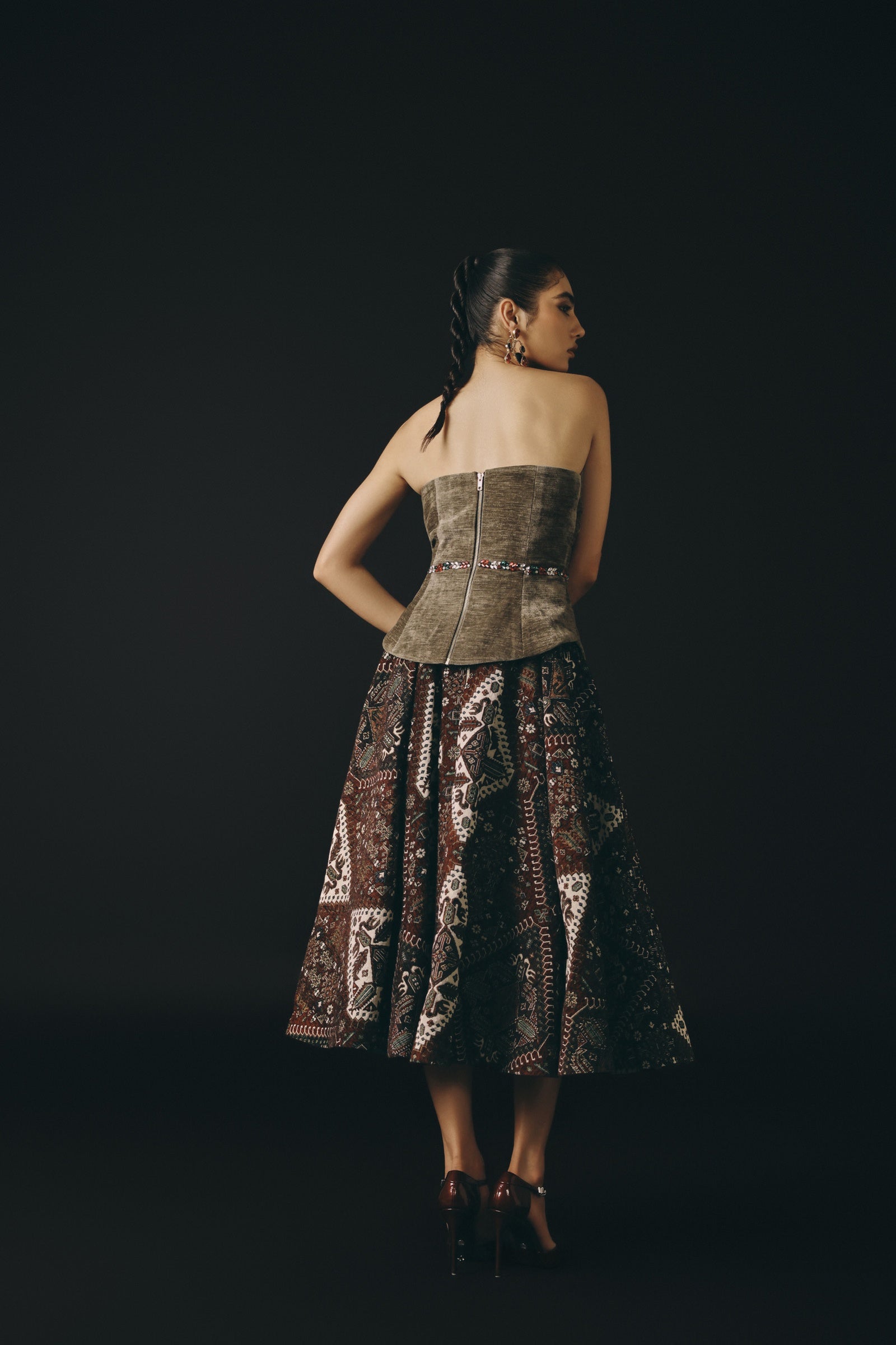 The strapless olive-toned structured top is tailored to create a clean and silhouette. It beautifully pairs with a full, voluminous midi skirt that showcases a rich print in deep earthy tones, burgundy, brown, cream, and black—adding texture and detail to the look.