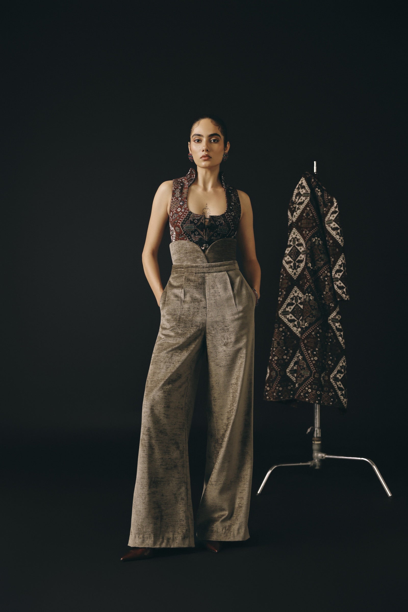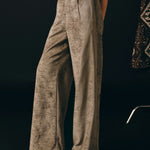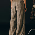 These are high-waisted, wide-leg trousers in a solid, muted taupe or olive-beige color. The fabric has a substantial texture, creating a beautiful drape and structure. It features a fitted waistband in a contrasting olive tone. The voluminous cut offers a dramatic, elongated silhouette.