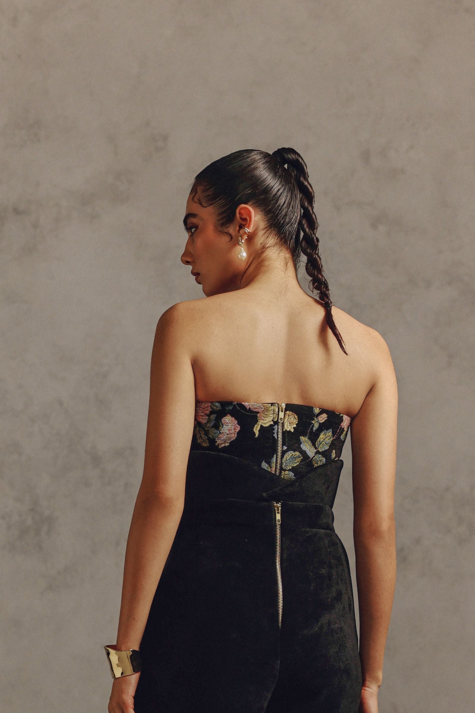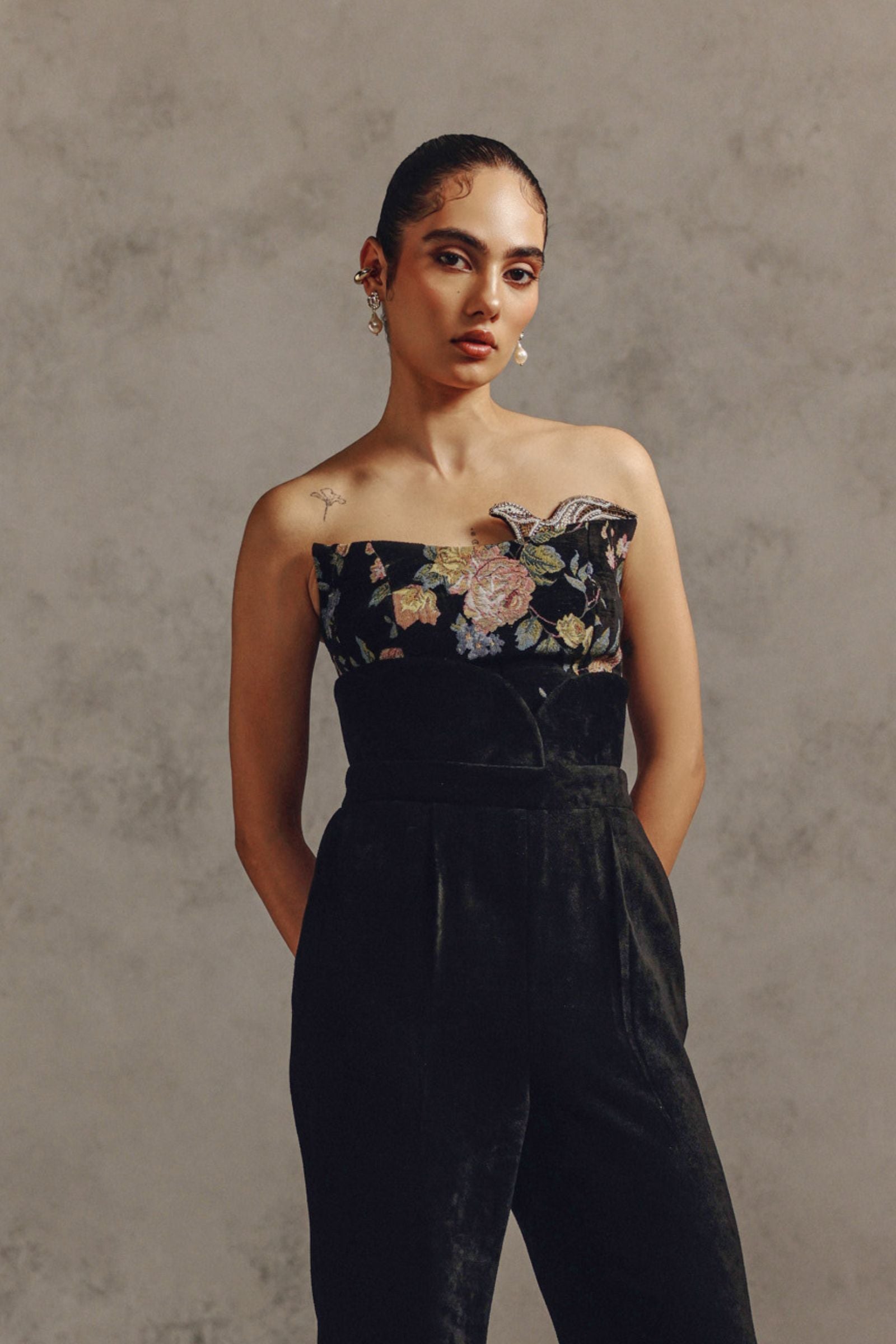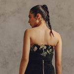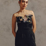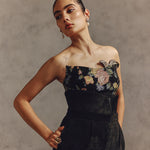 This strapless top features prominent embroidered floral motifs across the chest in muted colors like blush pink, olive green, and yellow. The top is fitted and structured, adding a refined, sophisticated, and slightly romantic style to the look. Can be worn alone with high-waisted tailored trousers for an evening look.