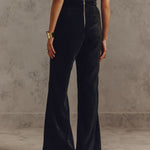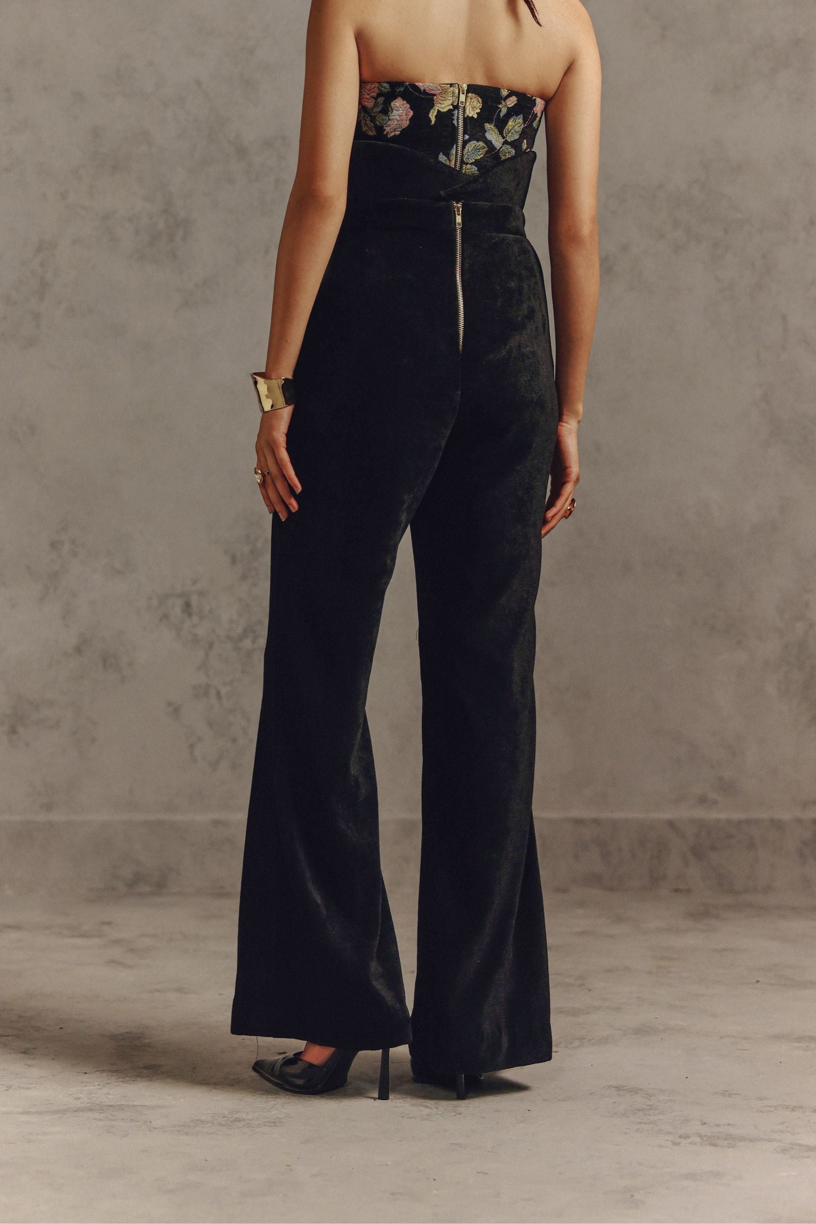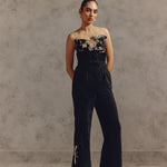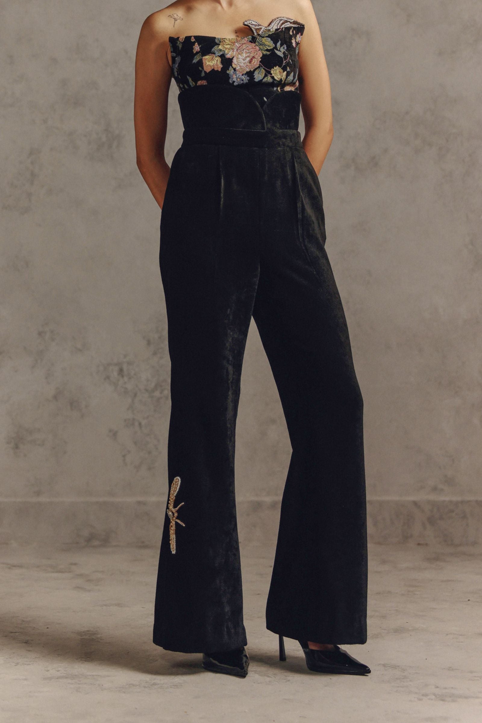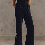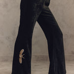 The pants offer a sumptuous drape and a subtle sheen that exudes quiet richness. the gold hand embroidered dragonfly at the bottom left adds an unexpected note of artistry. This delicate detail creates a perfect contrast, adding a touch of artistry to the refined minimalism of the pants.
