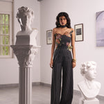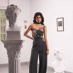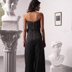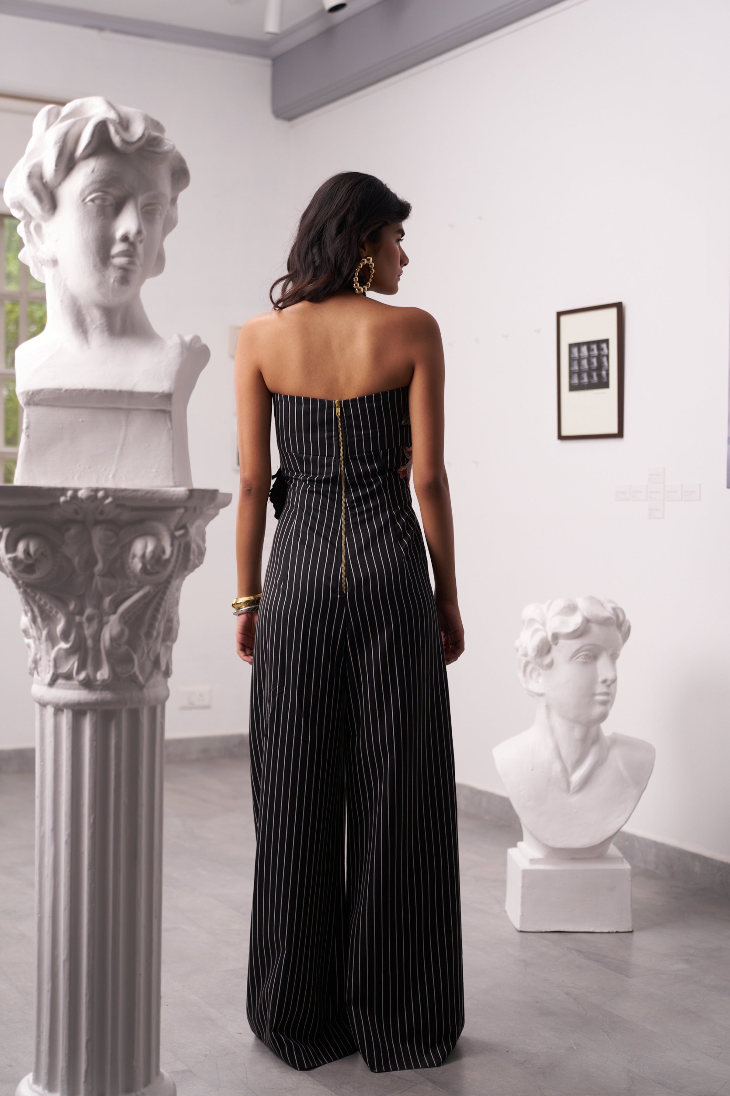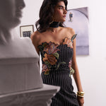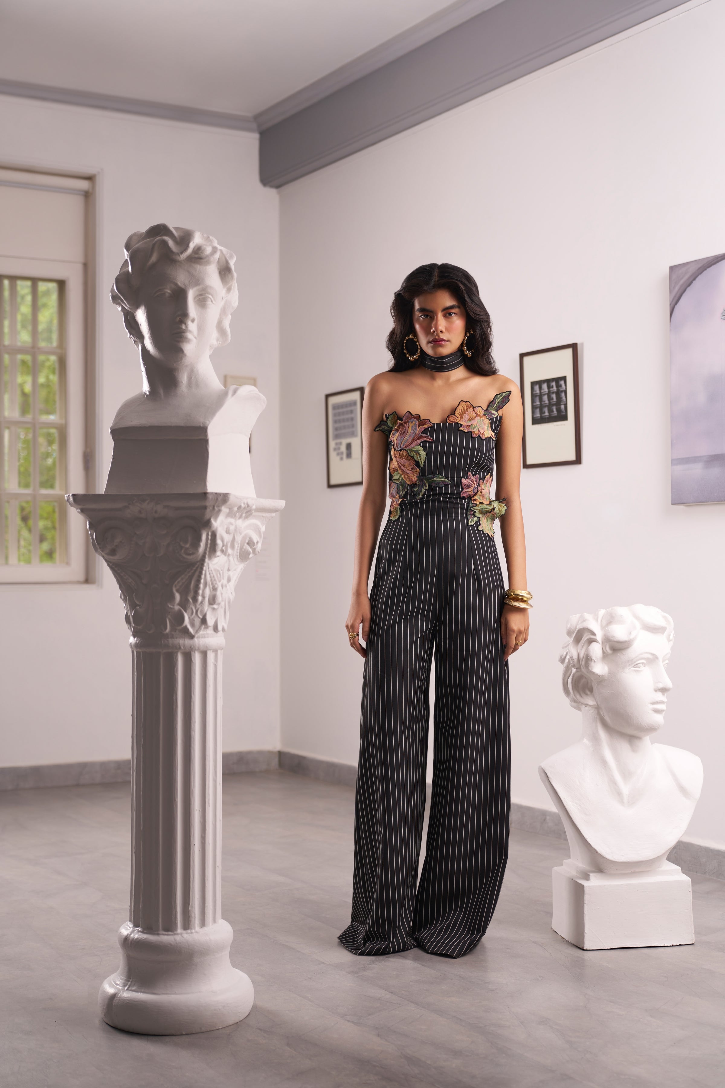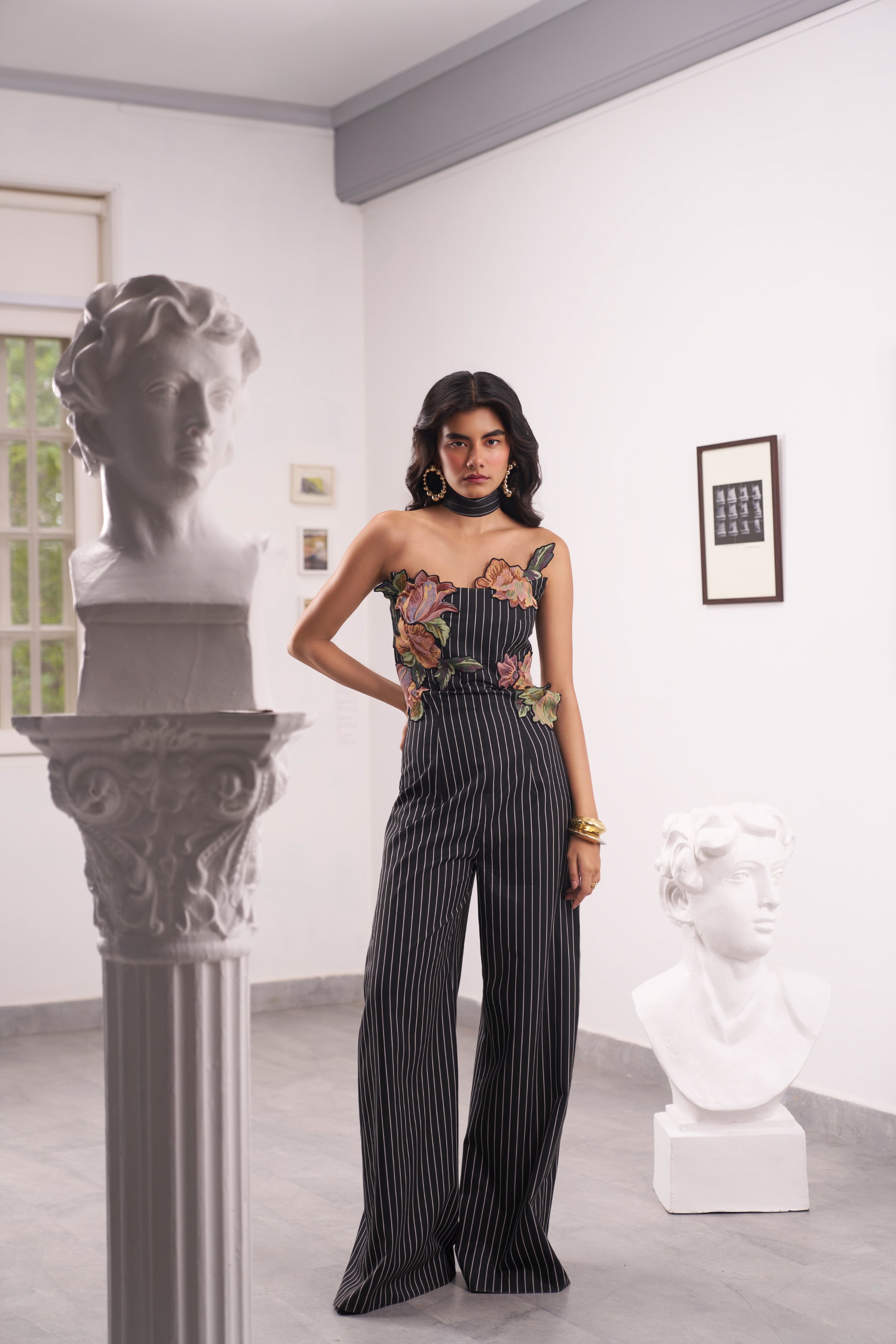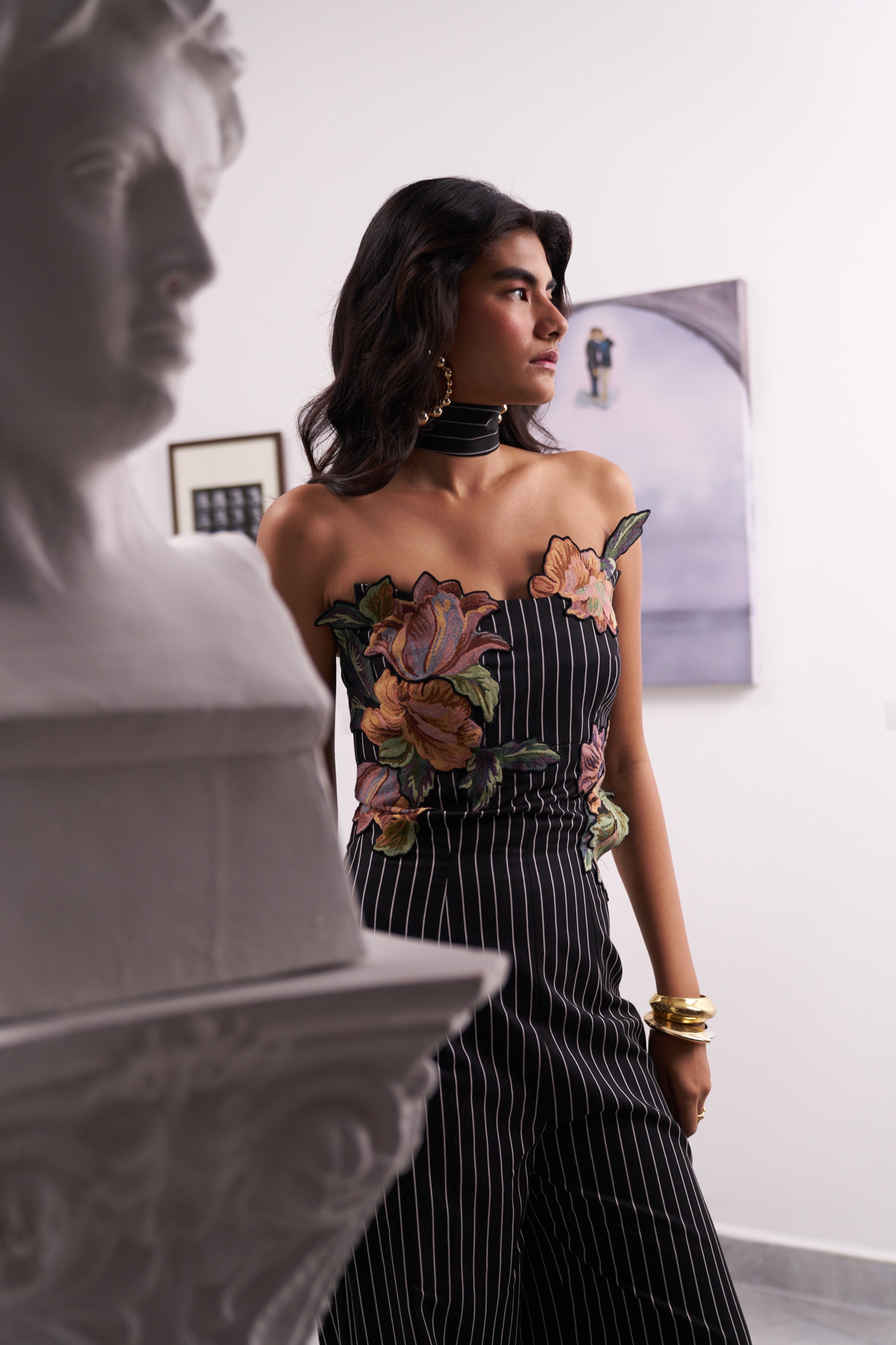Step into bold sophistication with this strapless black-and-white striped jumpsuit, featuring vibrant jacquard patchwork of orange and green florals on the bodice. The structured silhouette blends modern edge with artistic detail—made for moments that matter.