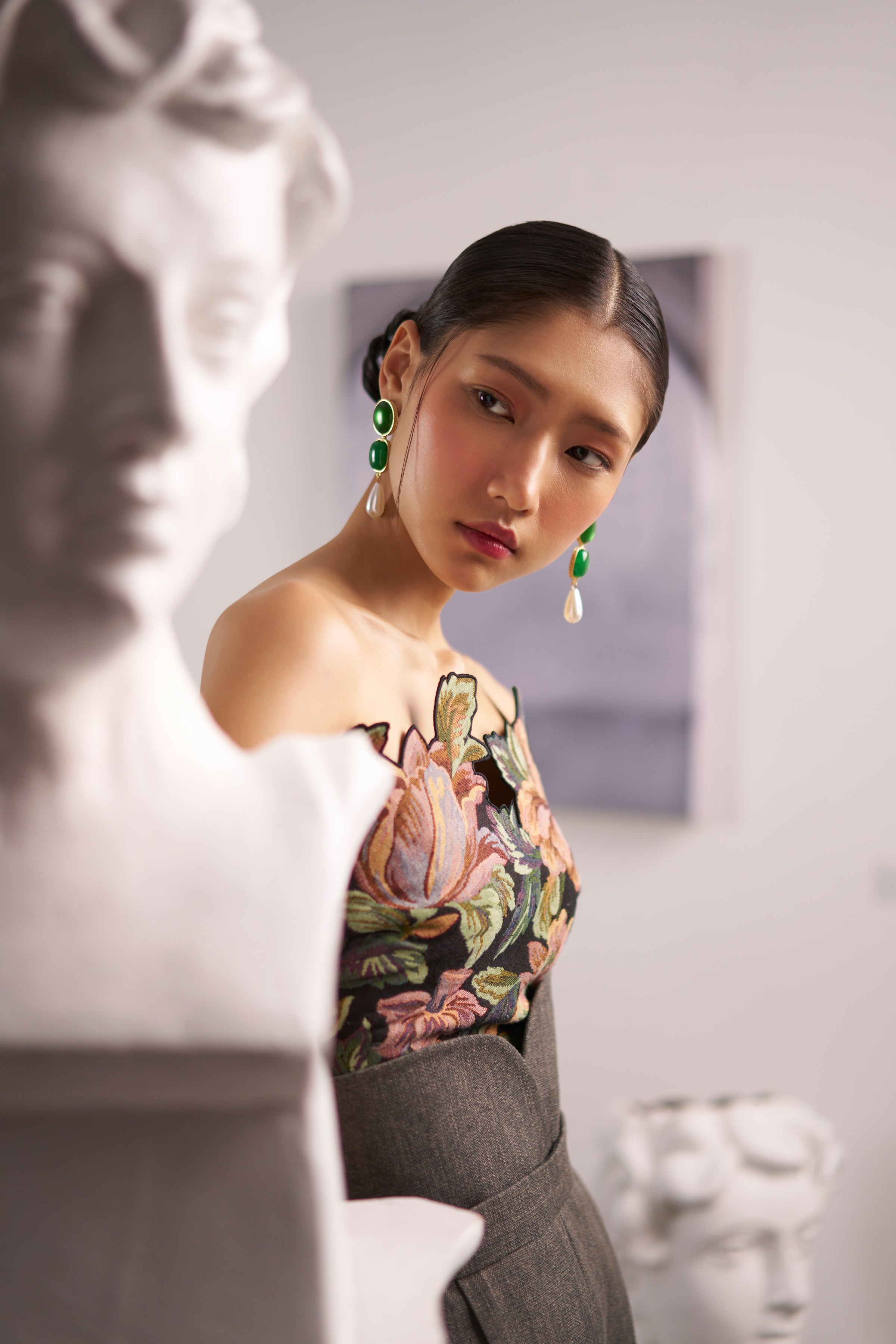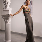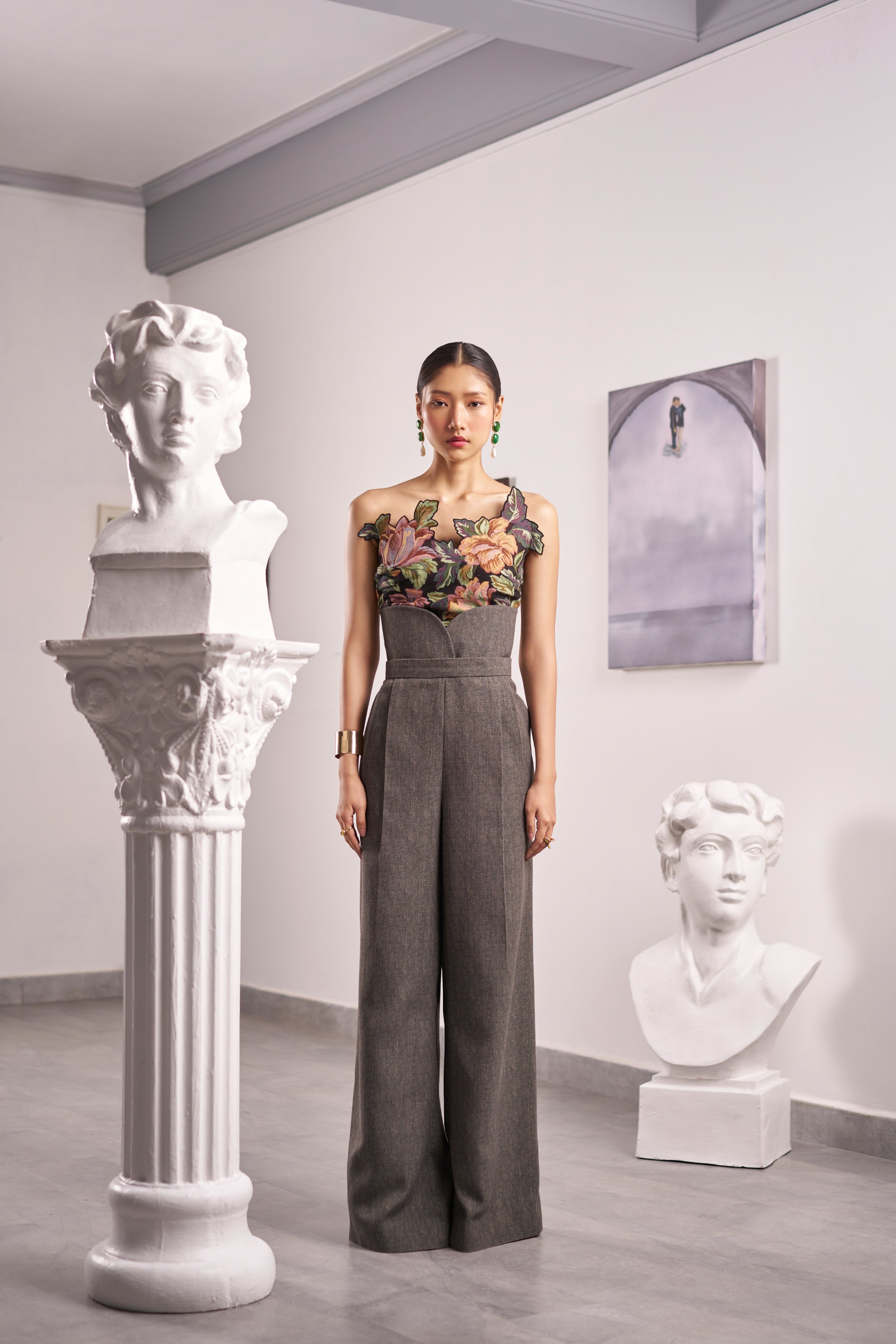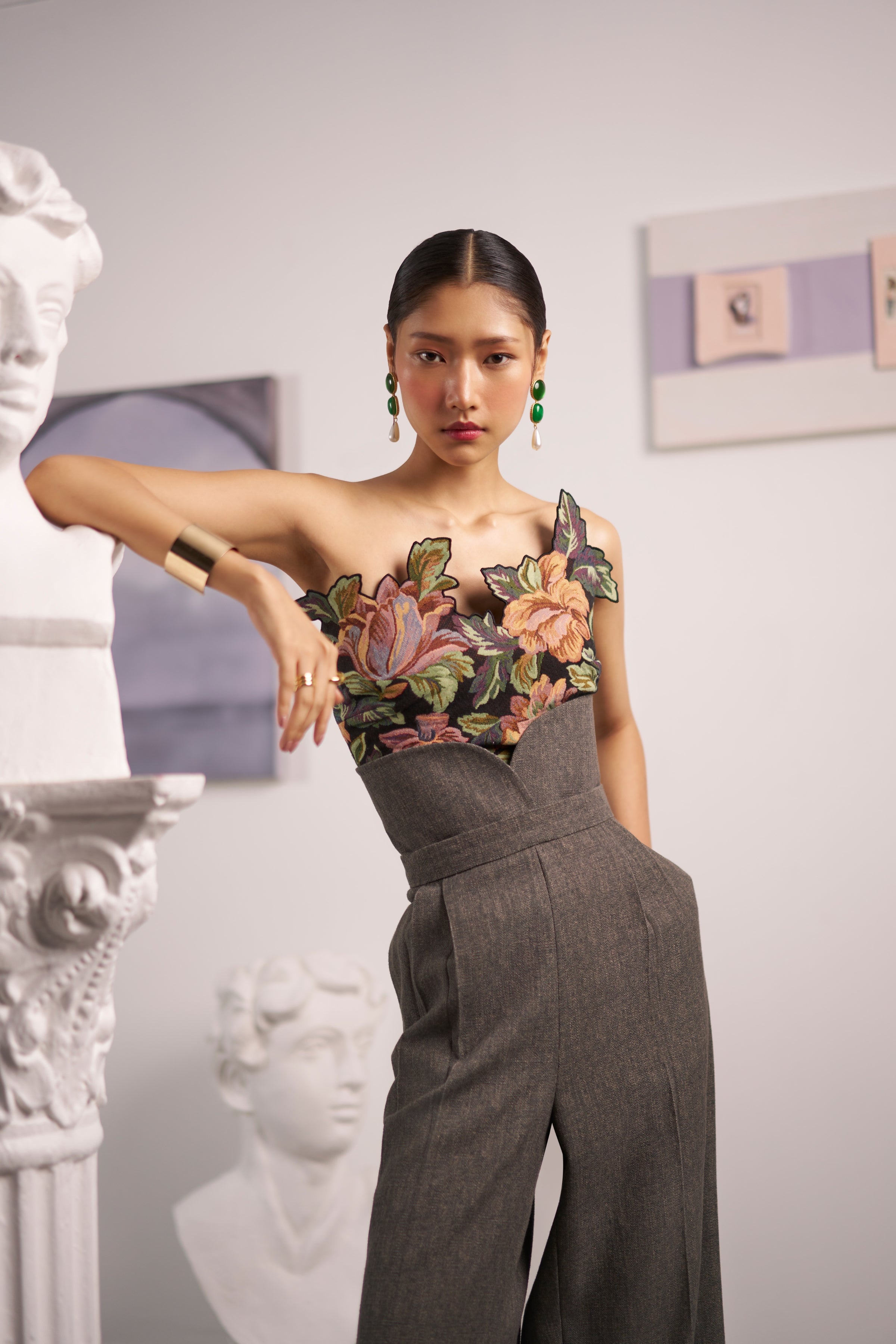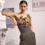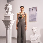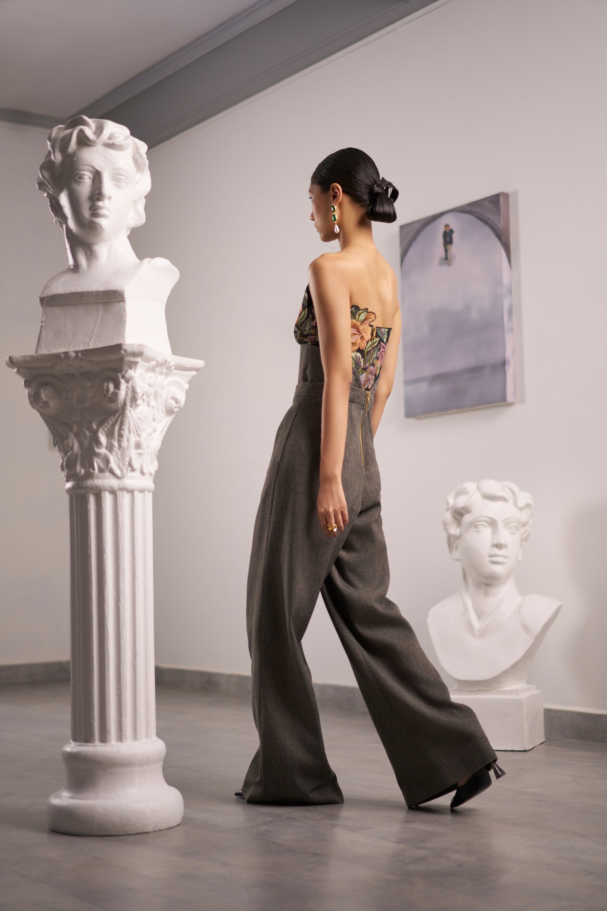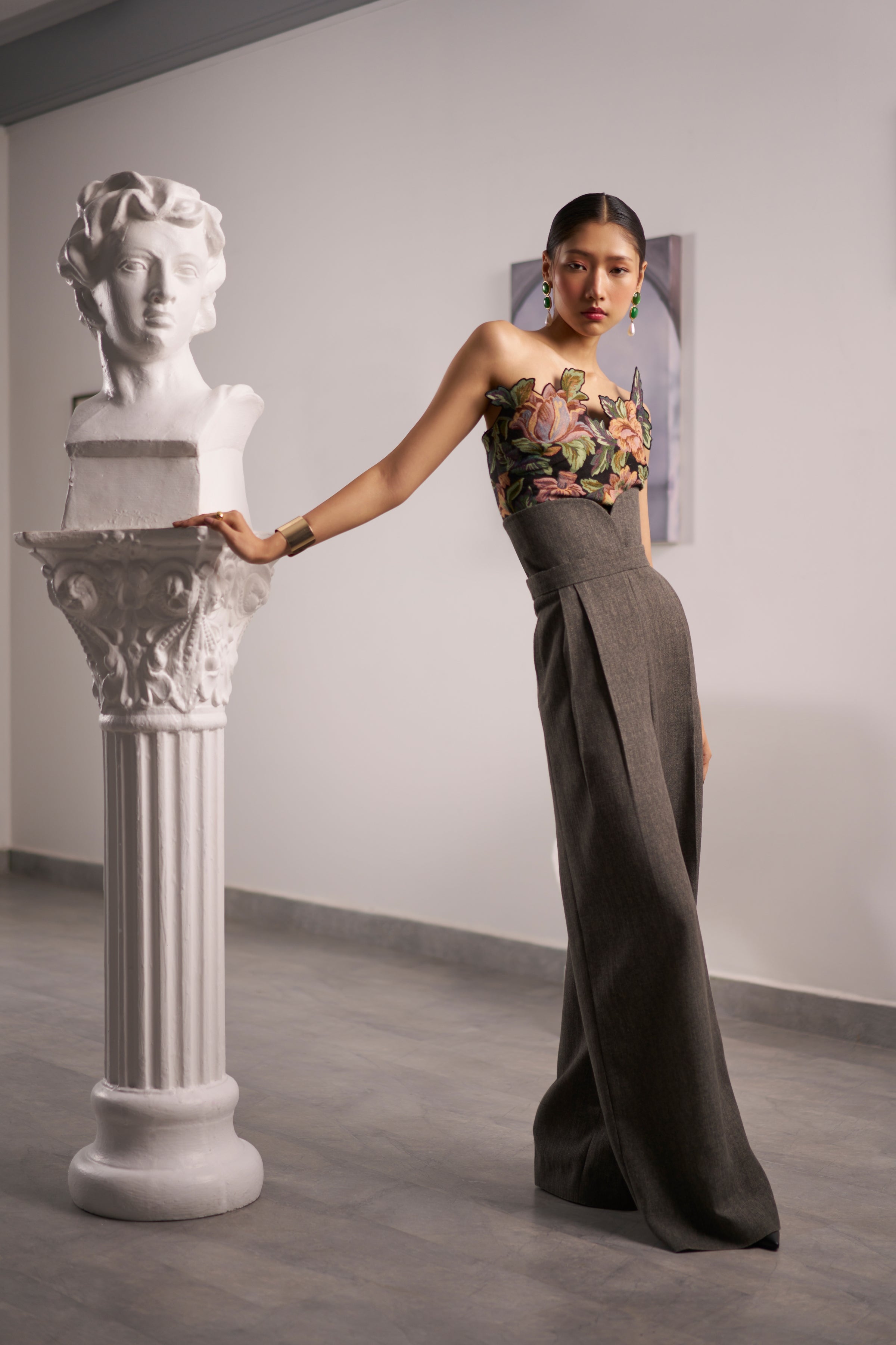 Effortlessly chic, this black-and-white striped cord set features high-waisted straight pants paired with a bold bandeau top. The top stands out with vibrant jacquard patchwork in orange and green floral motifs, adding a touch of artistry to the clean silhouette. A perfect blend of modern tailoring and statement detail.