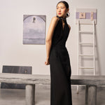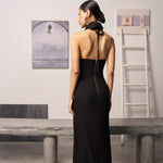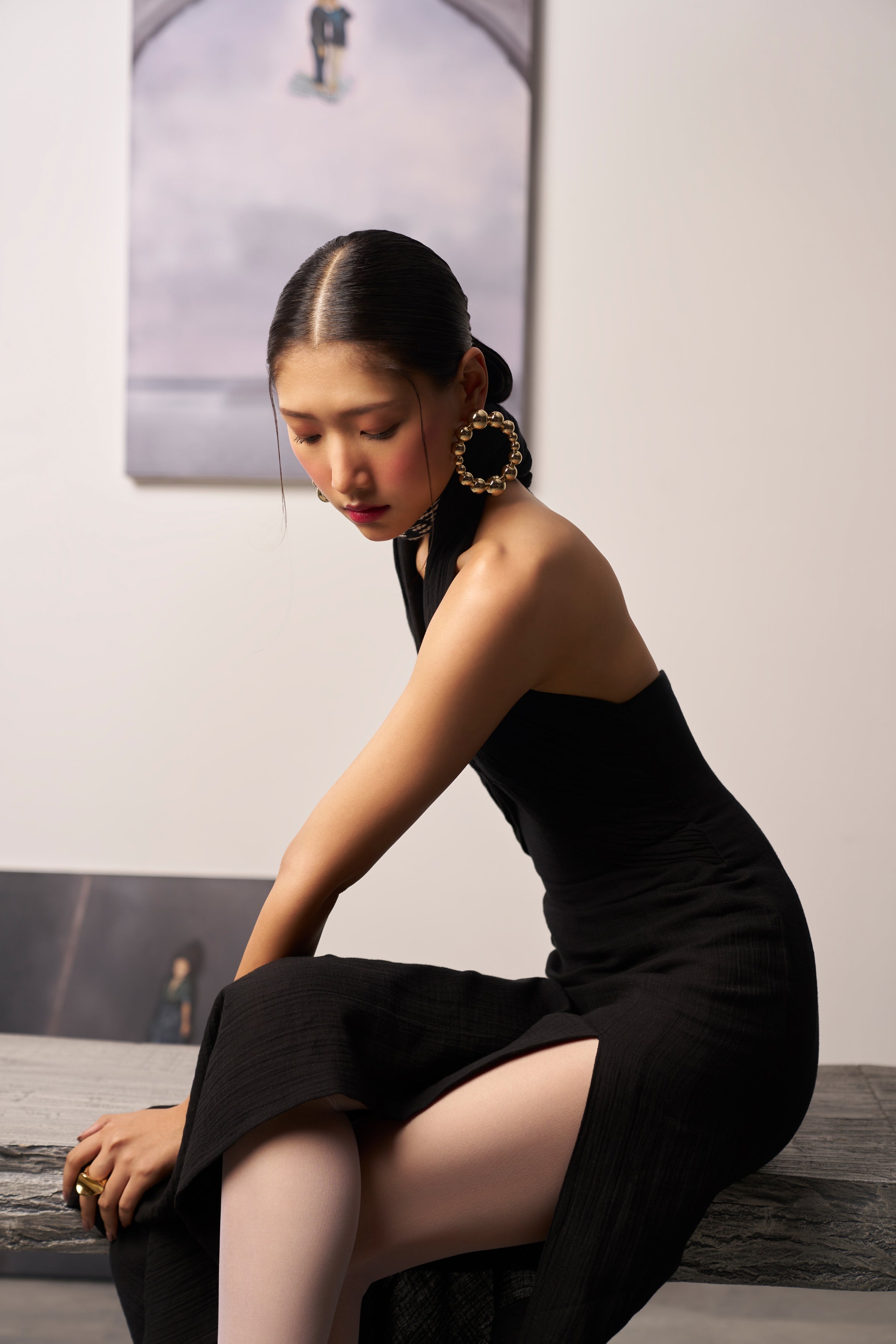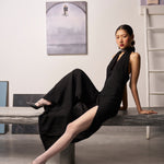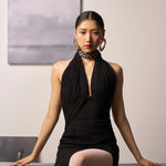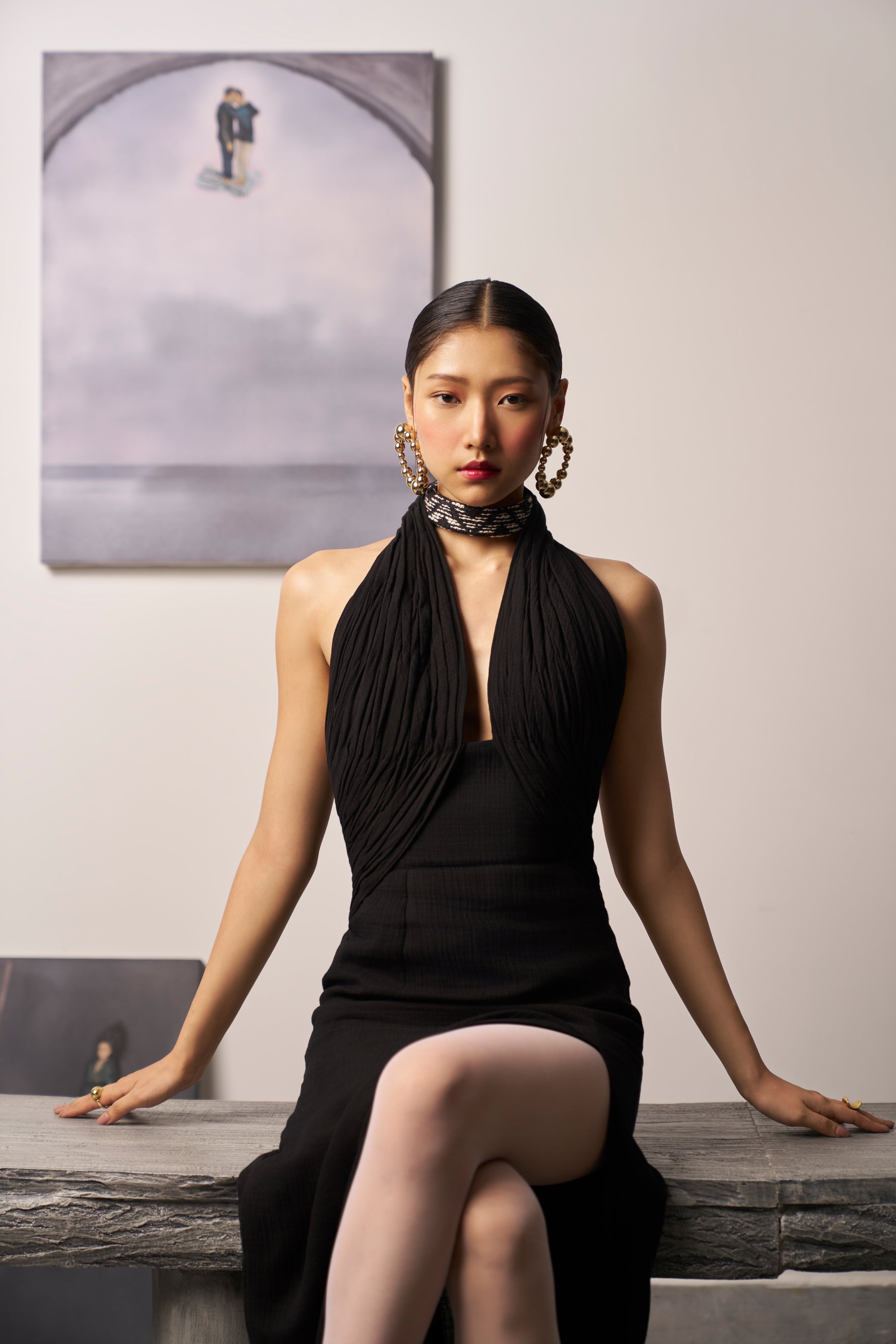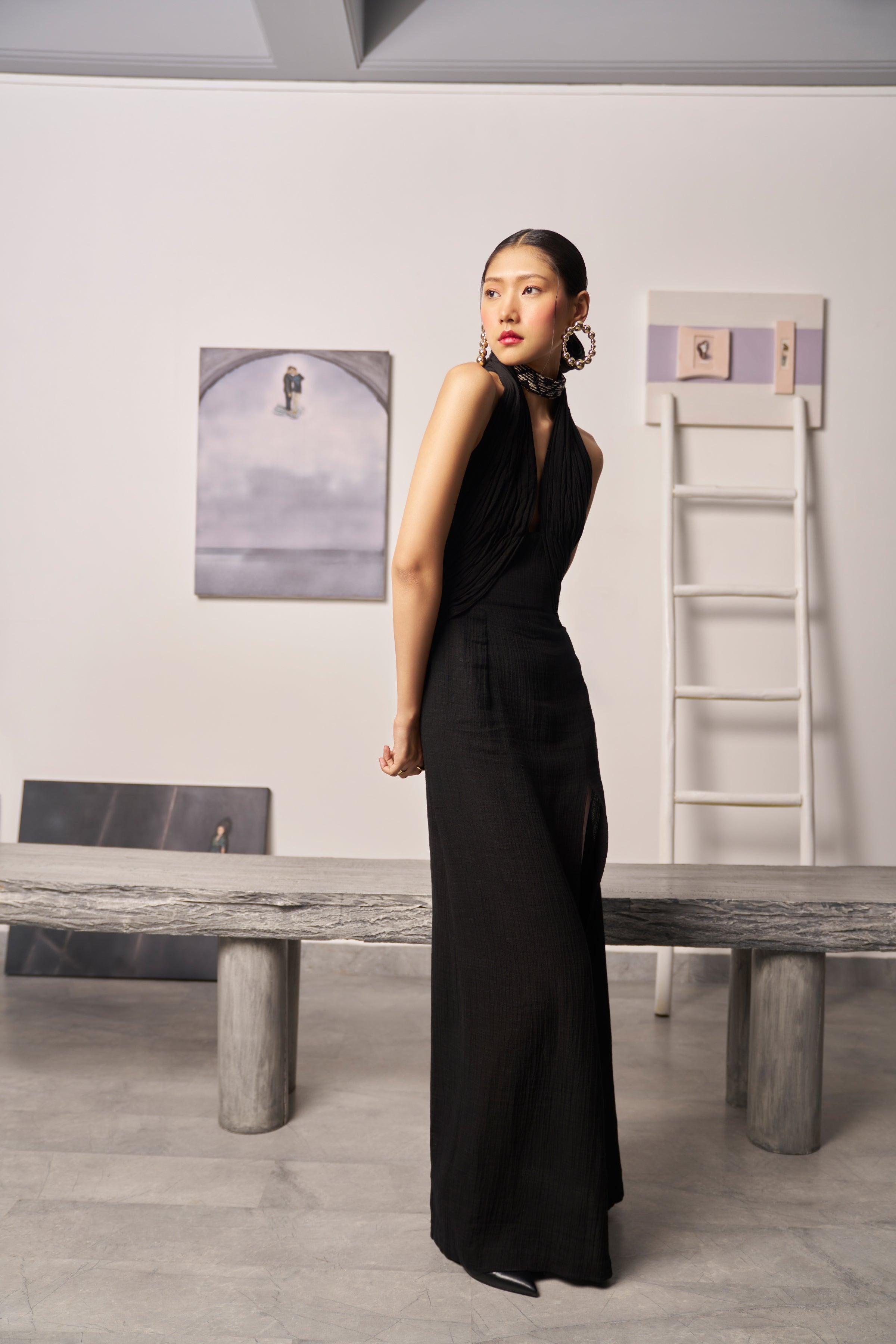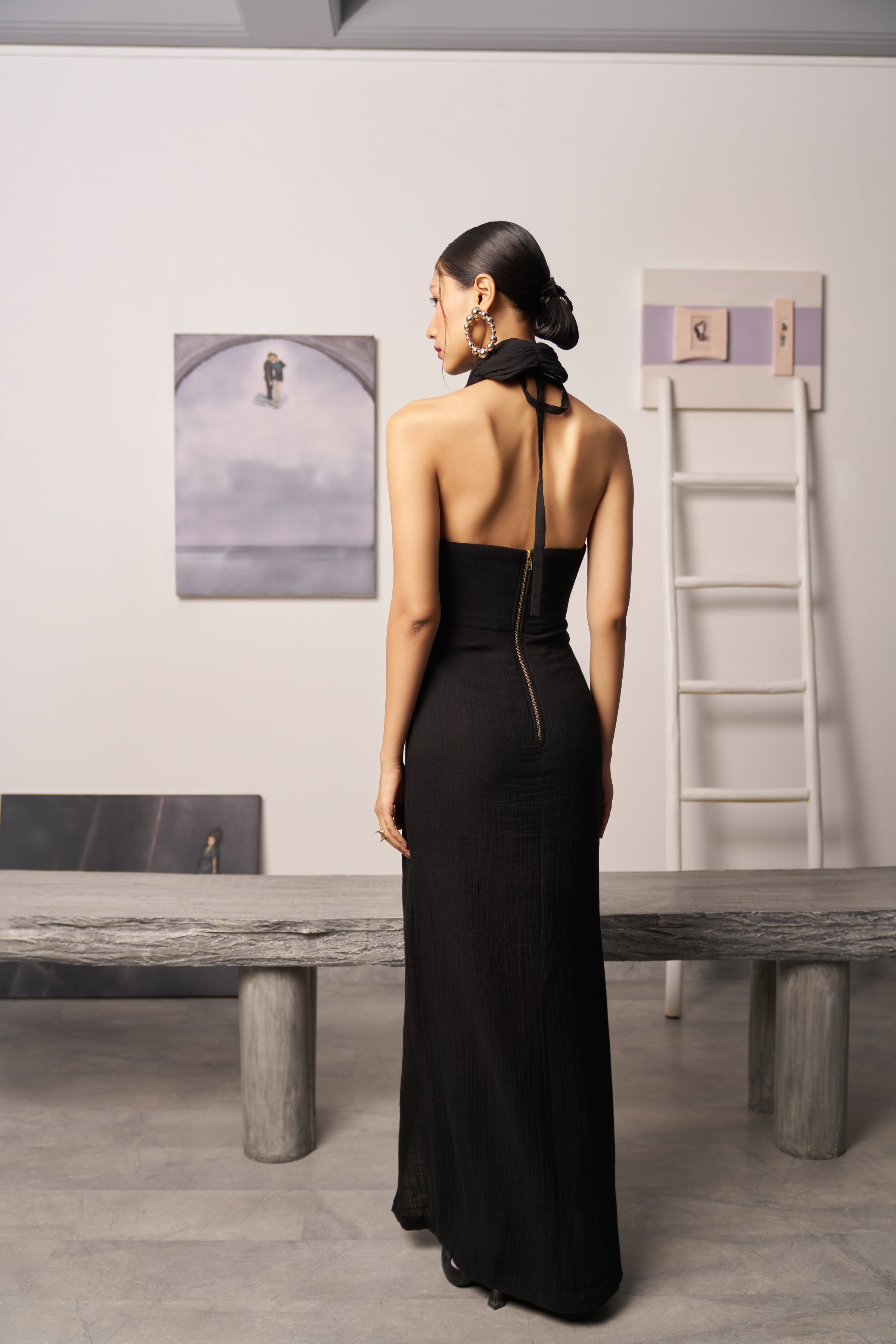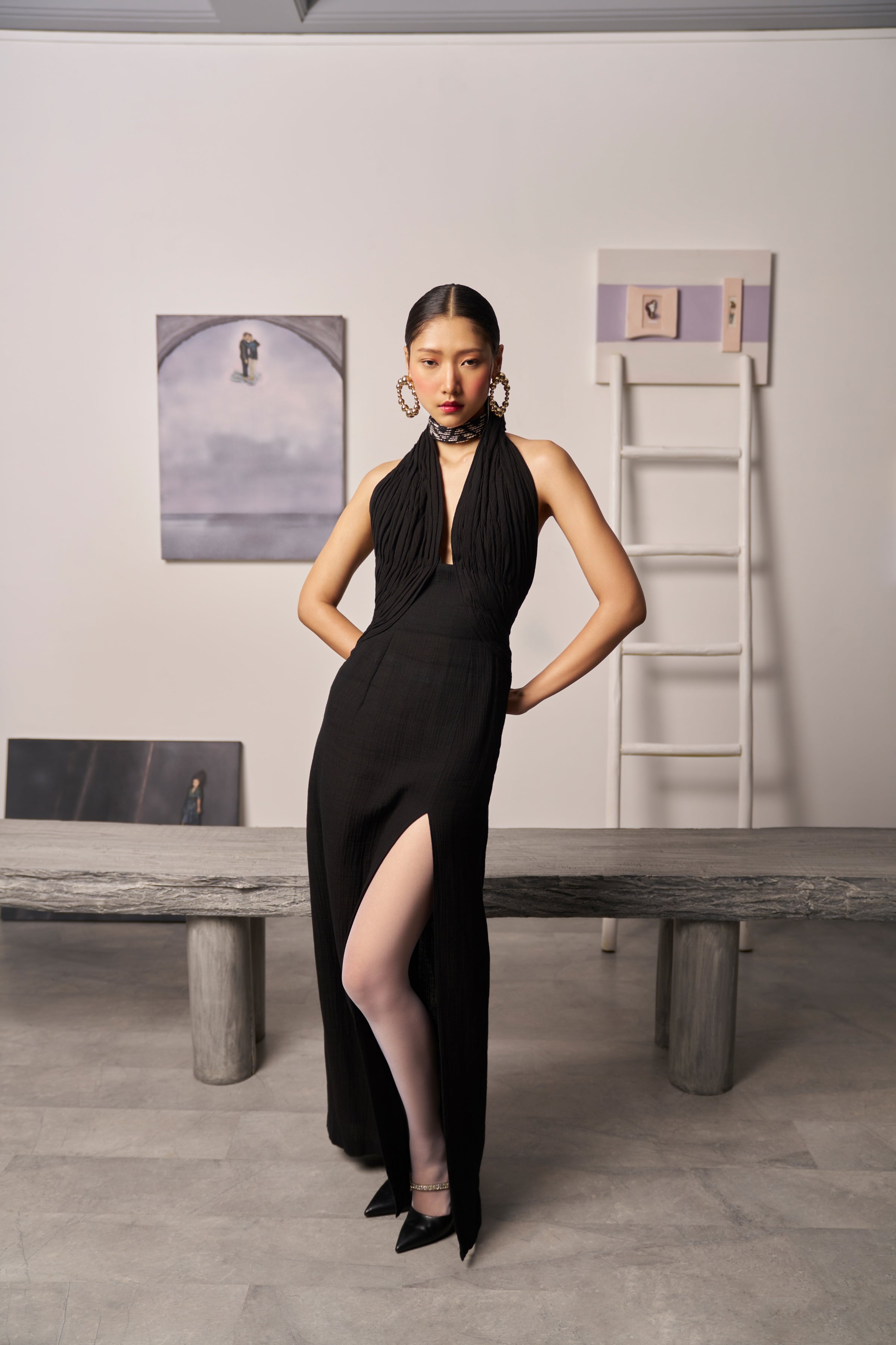 Sleek and sculpted, this black dress features a deep plunge neckline and a high slit that defines bold elegance. The textured fabric adds depth while the silhouette flatters with effortless allure. Perfect for evenings that call for a little drama.