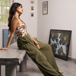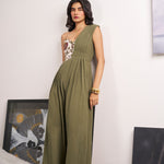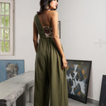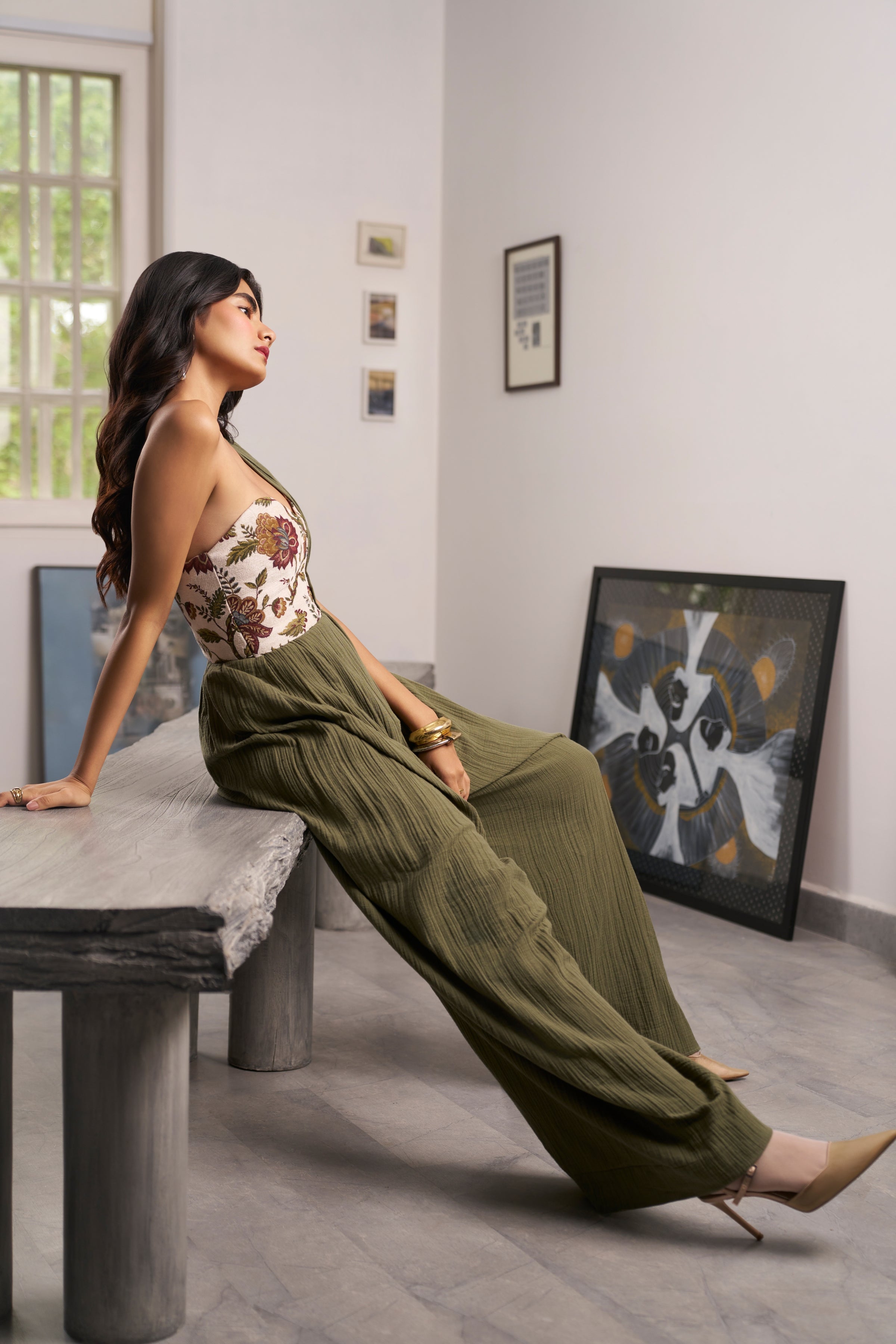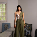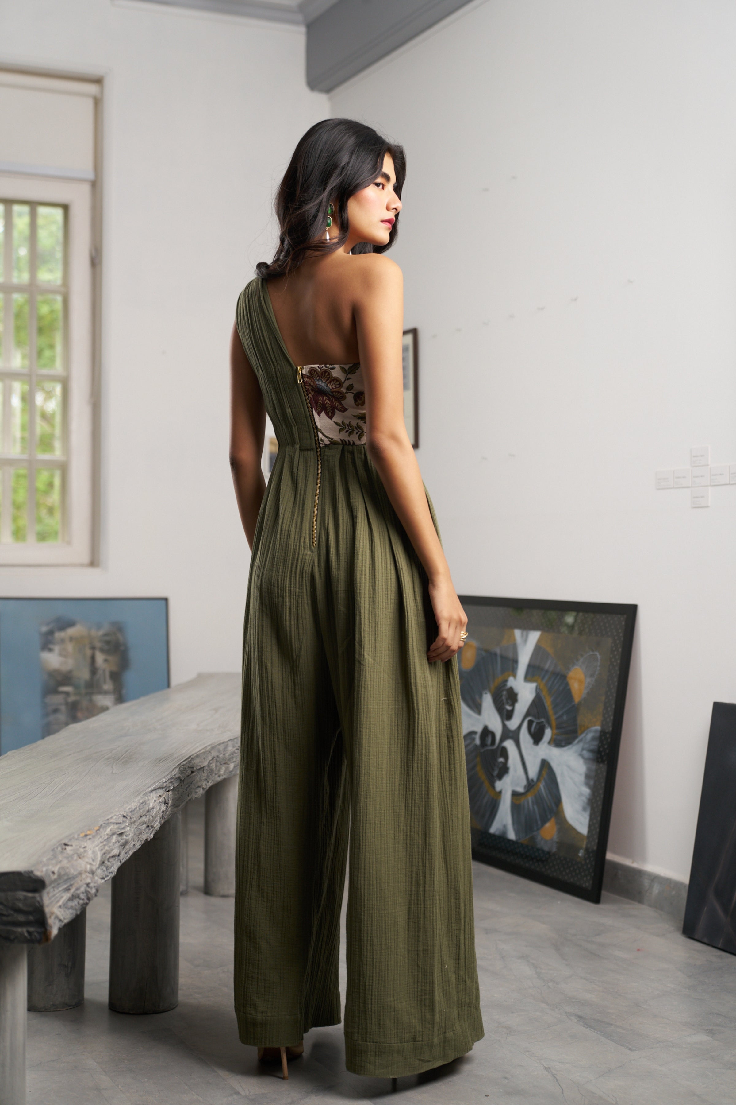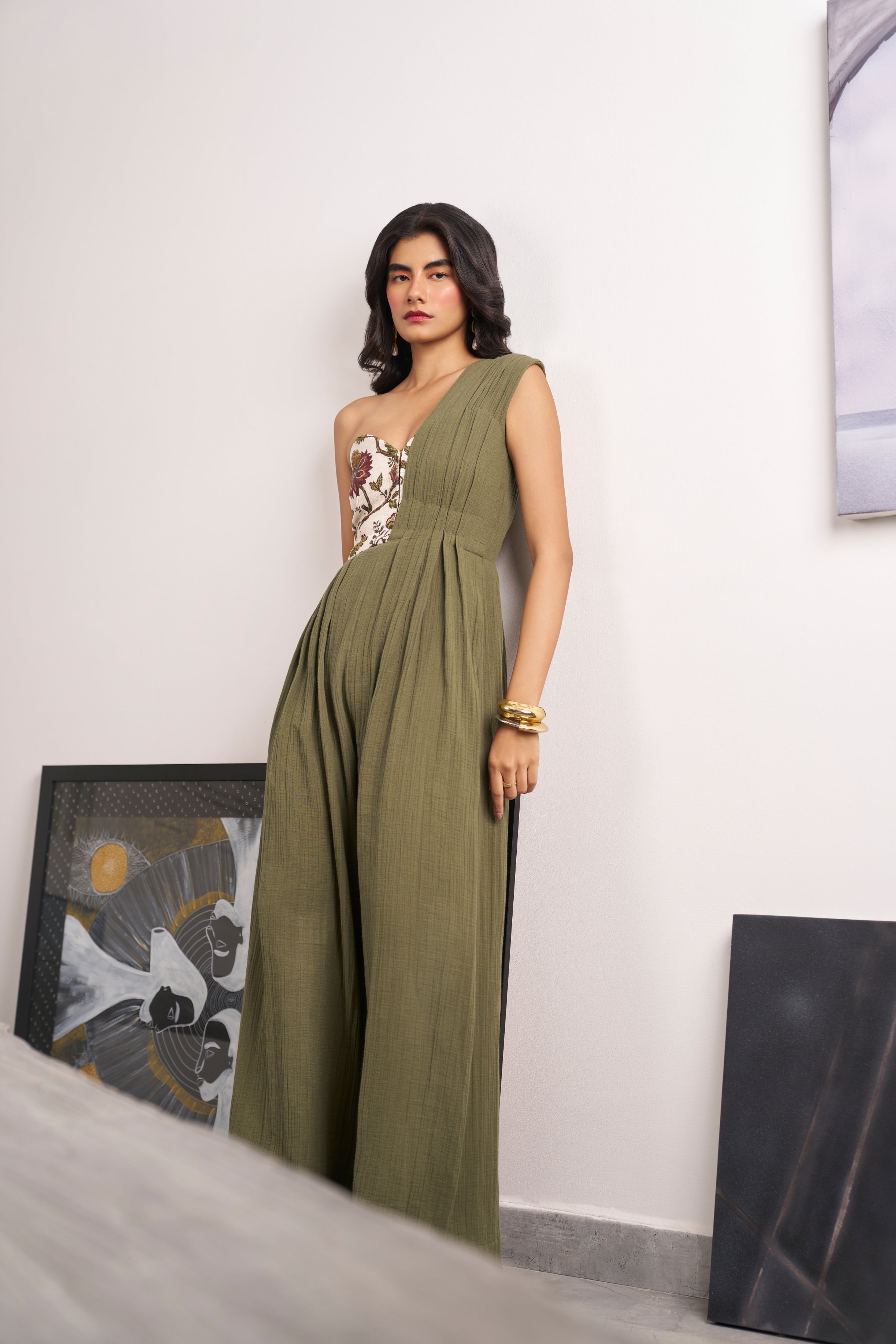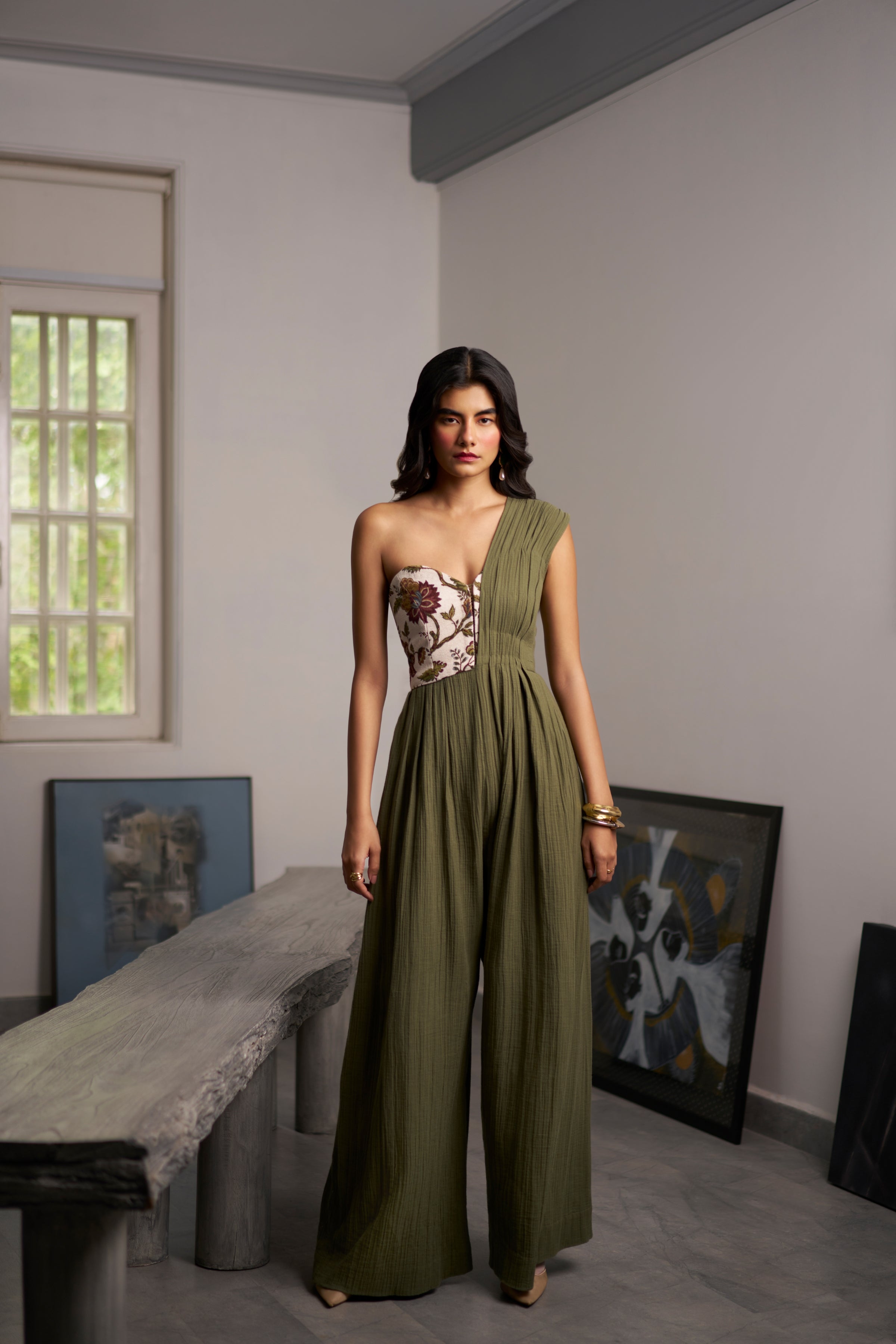 An olive green, wide-leg jumpsuit featuring a one-shoulder silhouette that beautifully contrasts with a corset-style bodice in floral embroidered fabric. The bodice on one side showcases a structured, romantic floral motif in earthy tones, while the other side flows seamlessly into a pleated drape that forms the jumpsuit’s single shoulder strap.