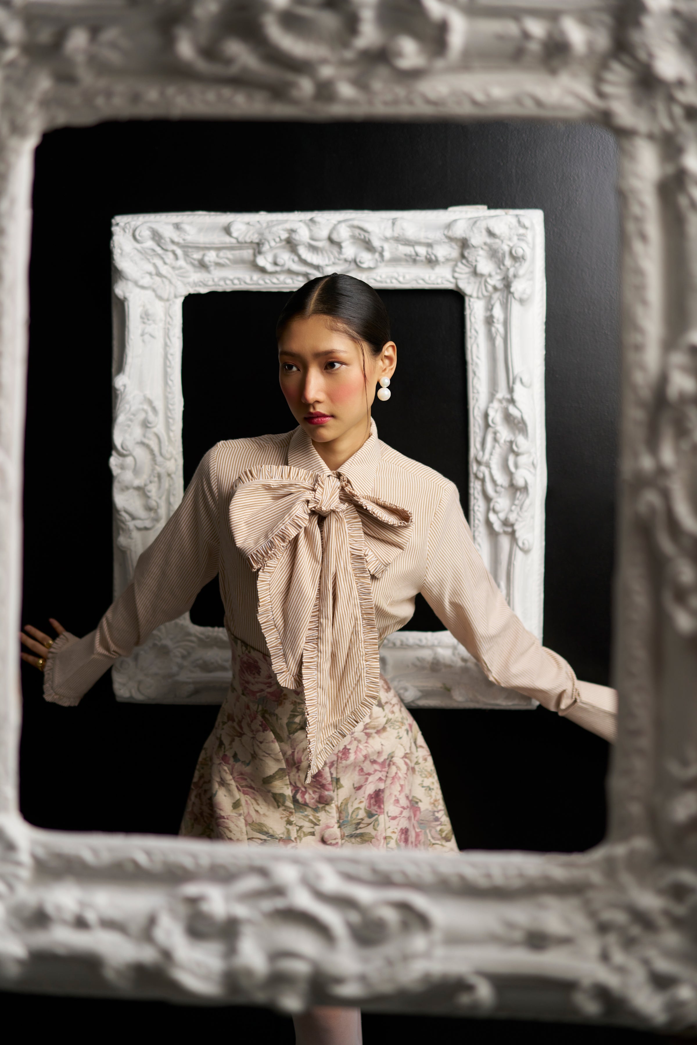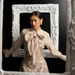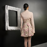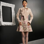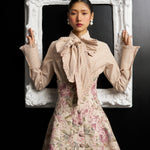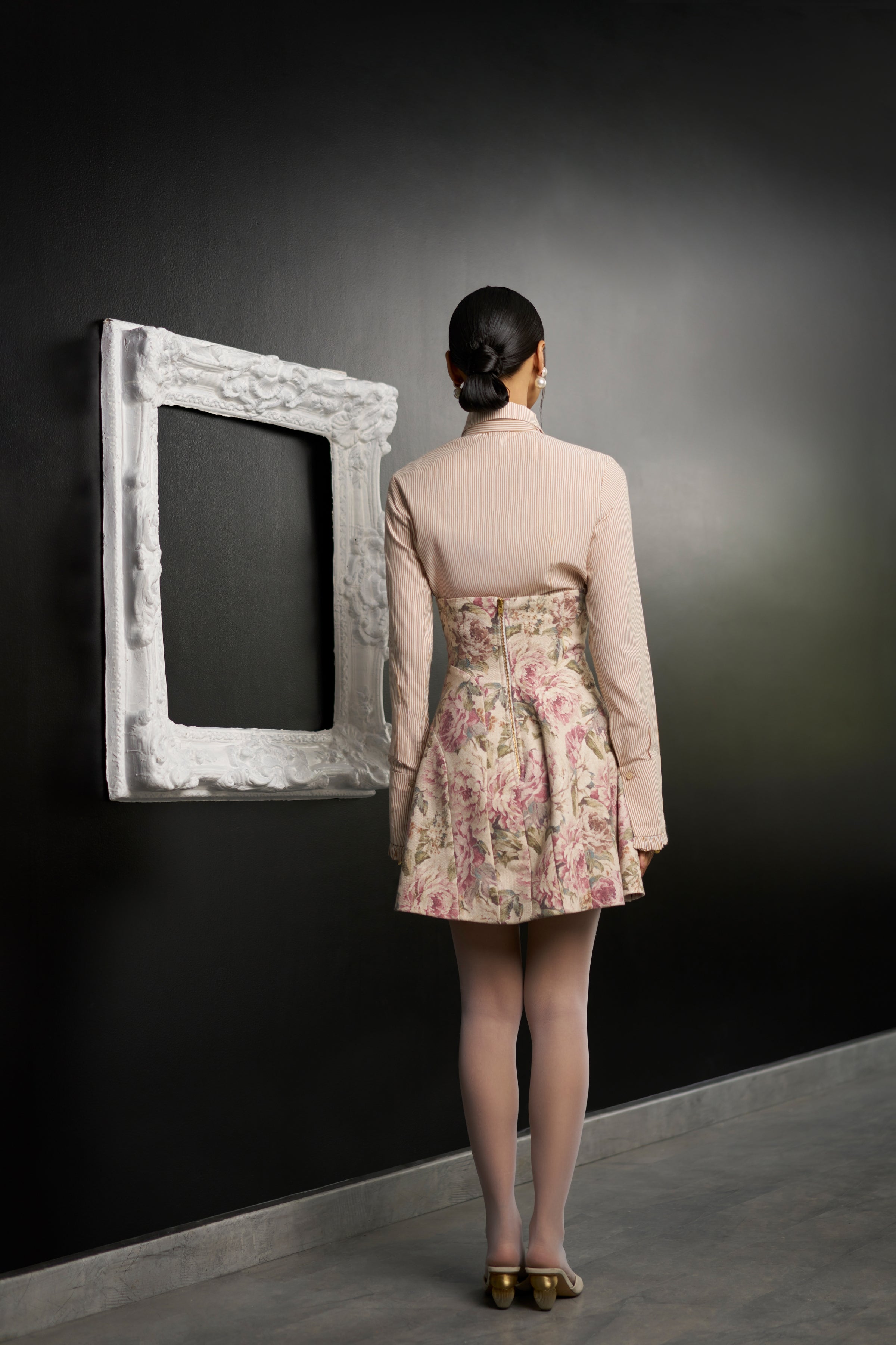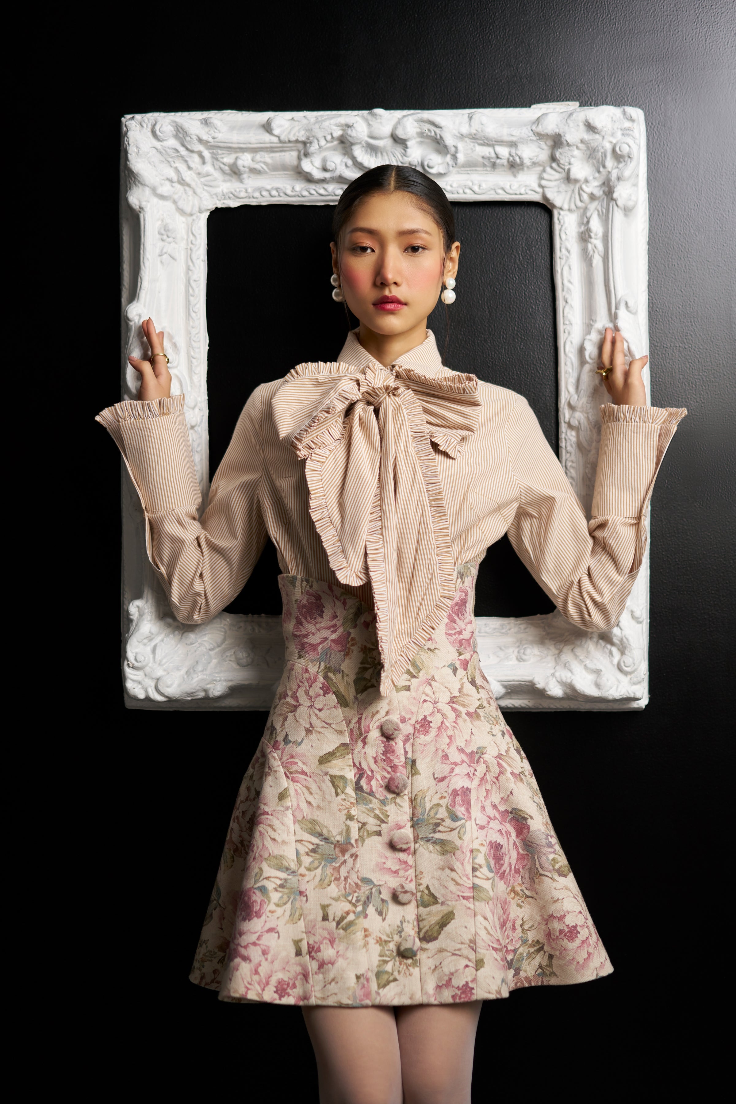 A romantic blend of structure and softness, this set pairs a pinstriped blouse with an oversized bow and ruffled cuffs with a floral mini dress in muted blush tones. Feminine, tailored, and quietly bold—perfect for refined daywear or statement evenings