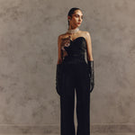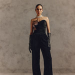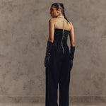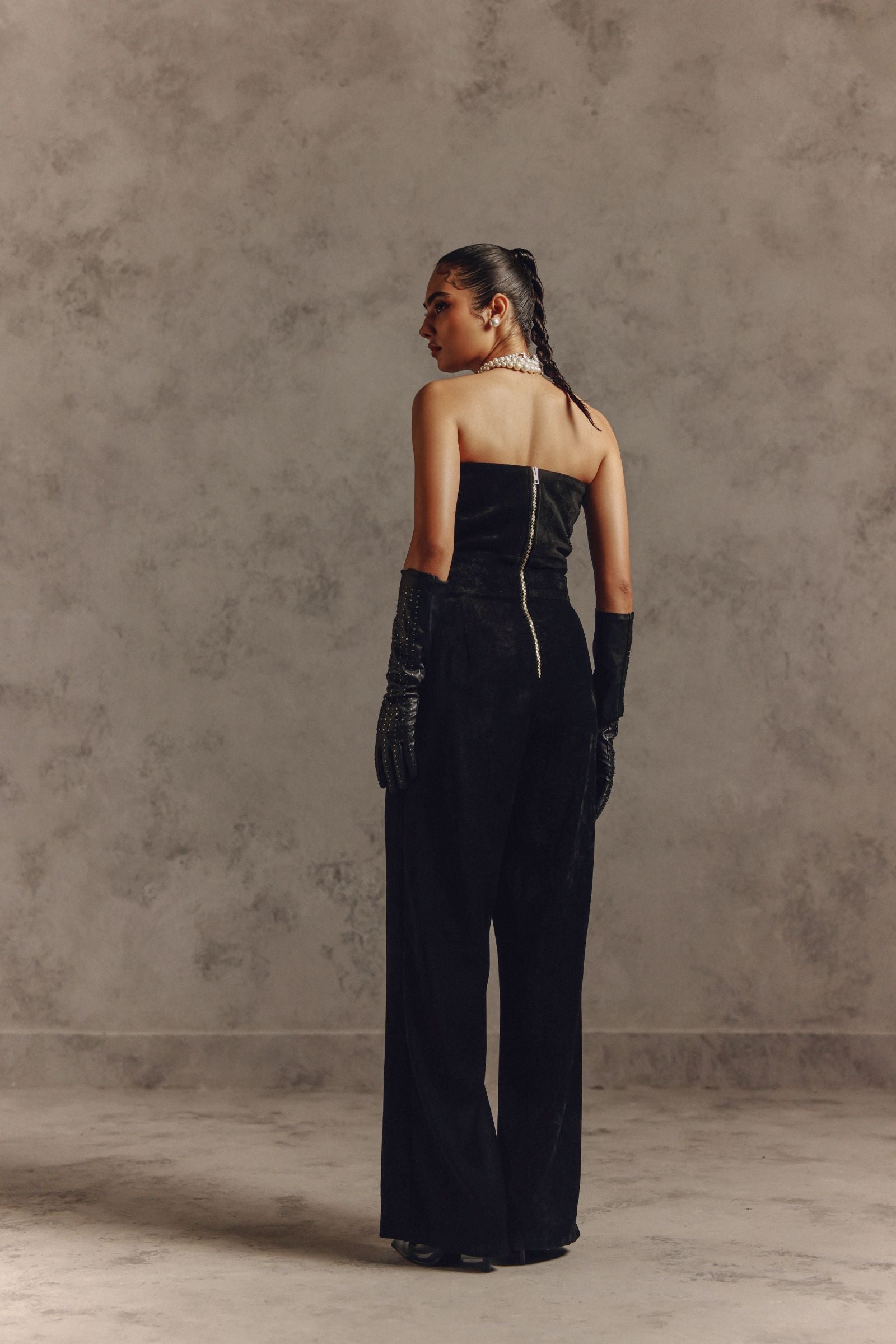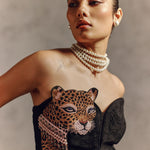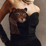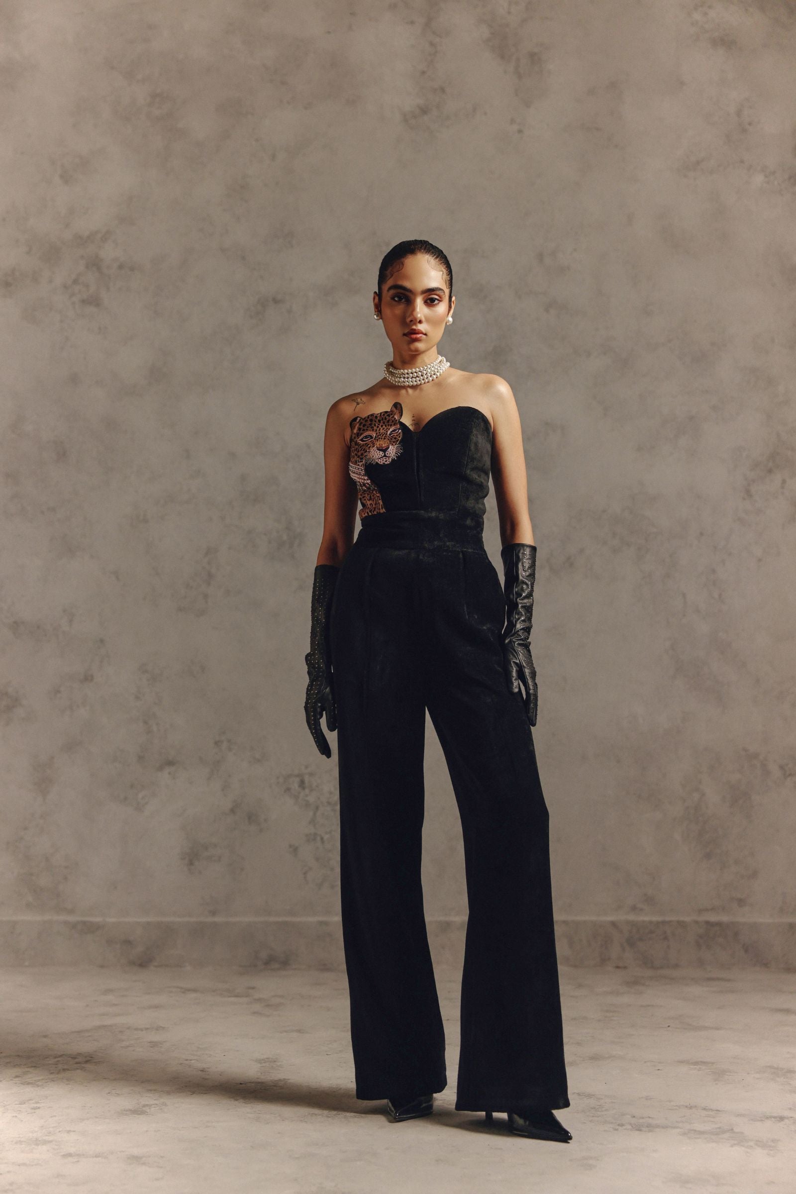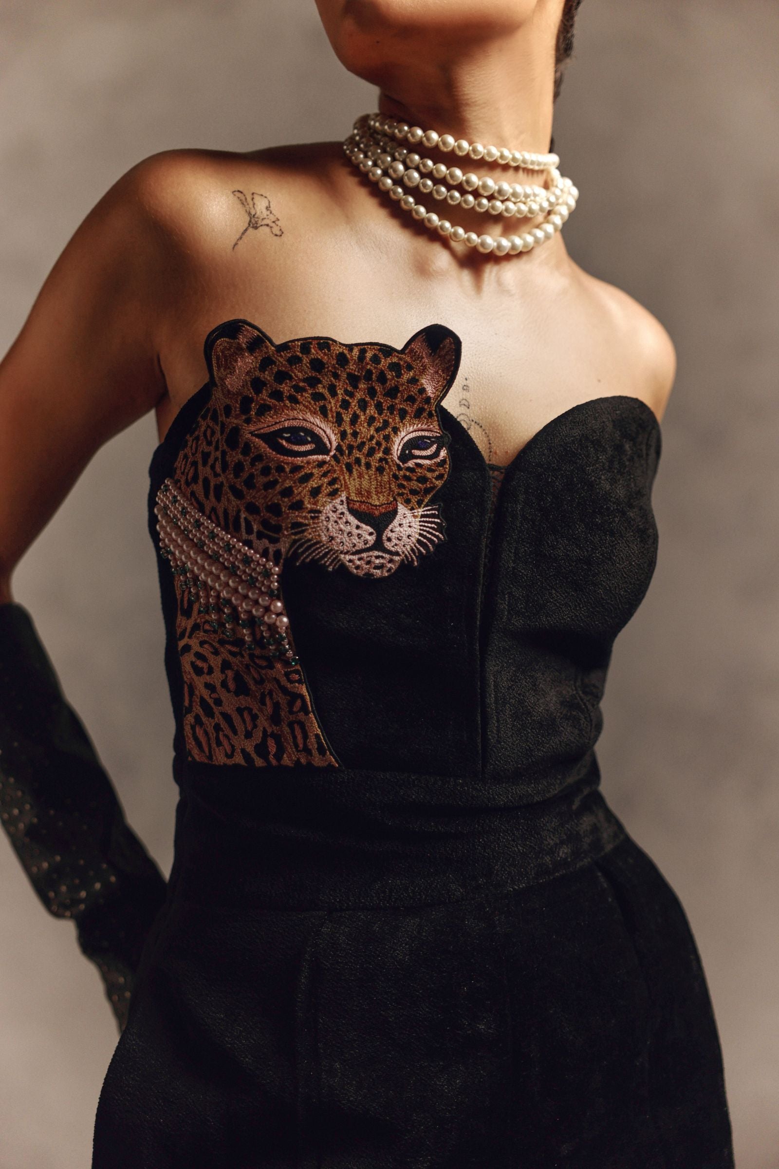 A sleek black jumpsuit featuring a bold hand embroidered leopard on the left chest, adding a fierce edge to the silhouette. Paired with smooth leather gloves, this ensemble perfectly captures a shadowy, dark winter vibe, sophisticated and daring.