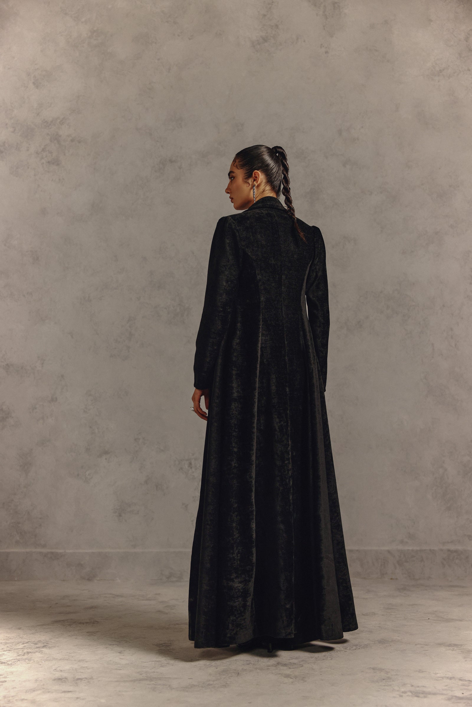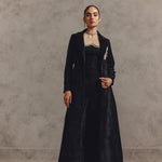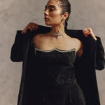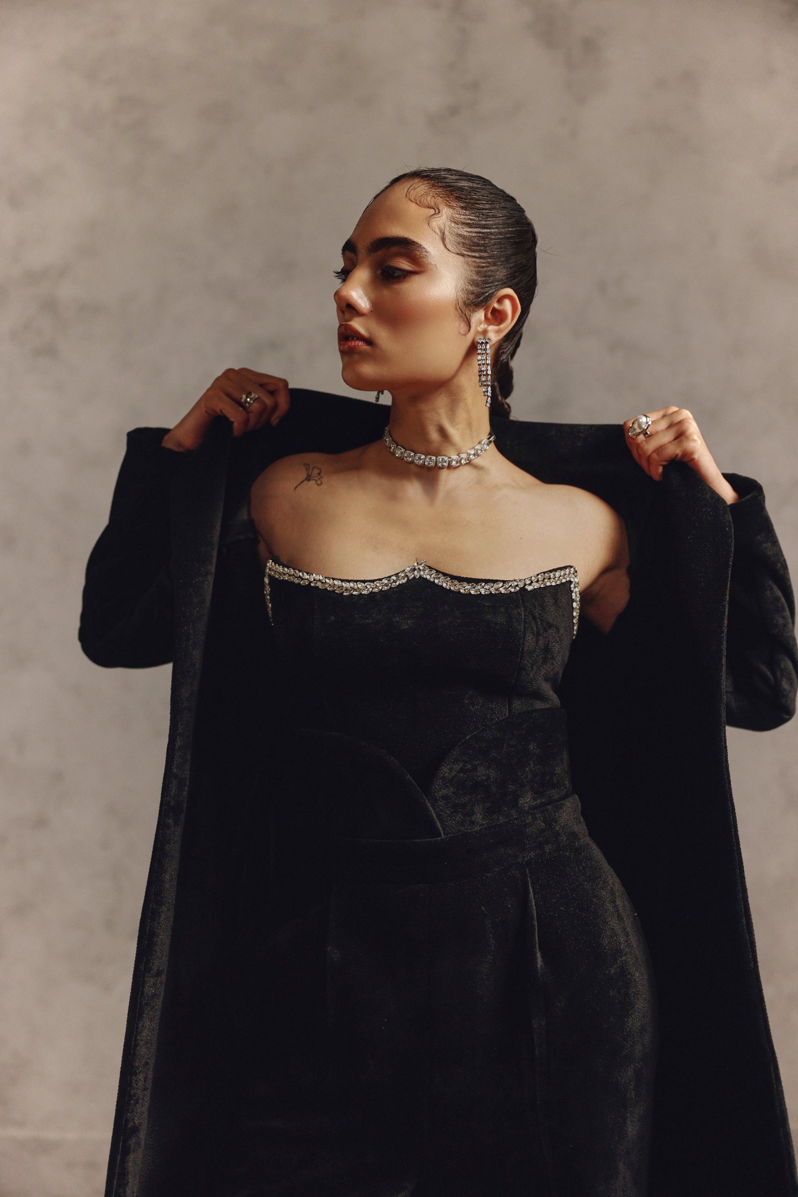 The sophisticated co-ord set which features a strapless top and tailored high-waisted pants accented by a gold hand embroidered dragonfly at the hem. Finished with a long, sleek black blazer delivers a modern polish.