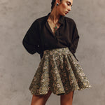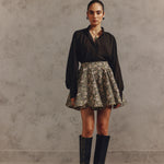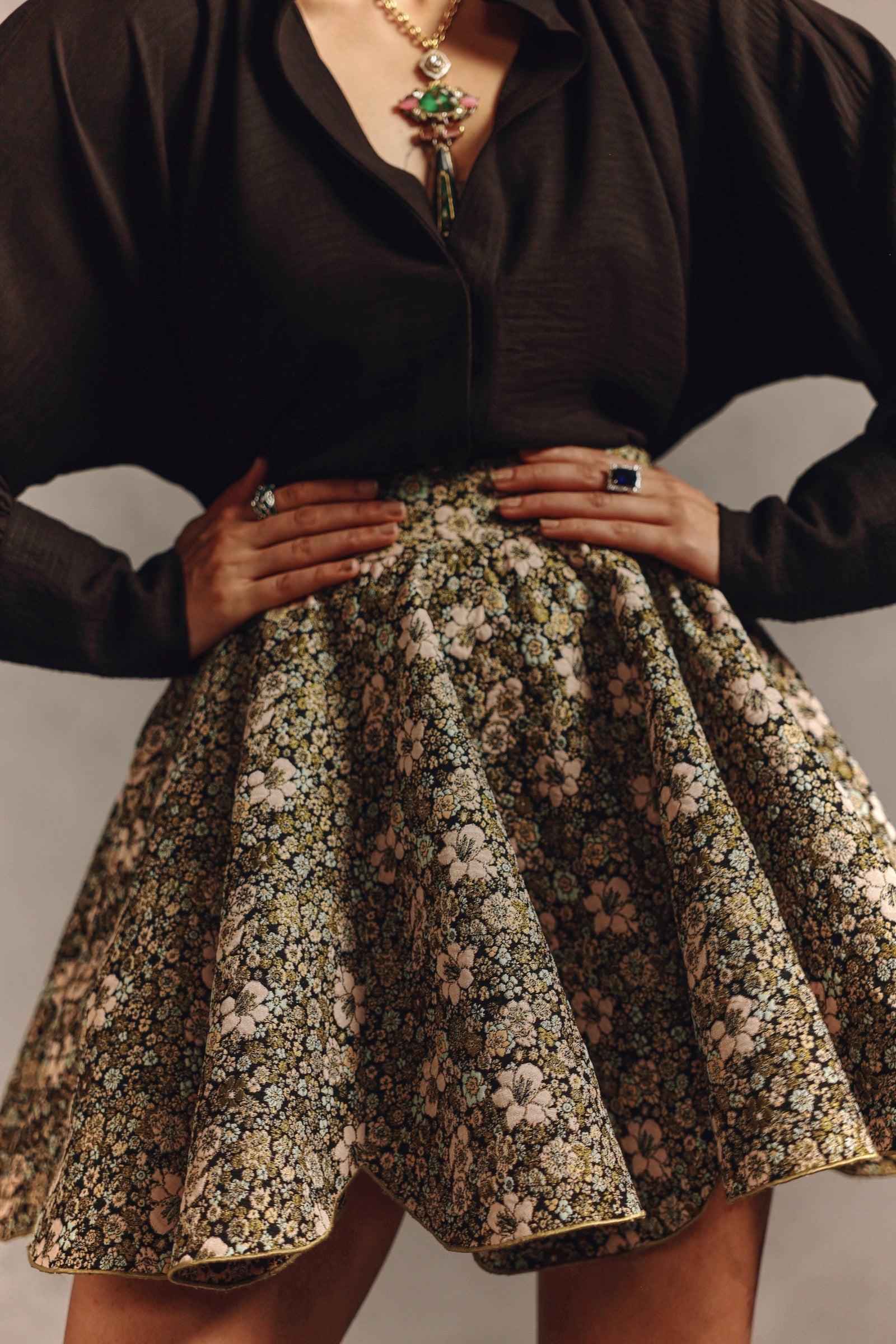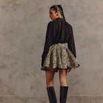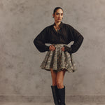 The outfit plays with volume, featuring a fluid, oversized black blouse that falls over a dramatically flared, high-waisted floral mini-skirt. The contrast between the flowing, untucked top and the sharp, structured hemline of the skirt is key. With the addition of high black leather boots it creates both relaxed in the torso and sharply defined style.