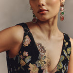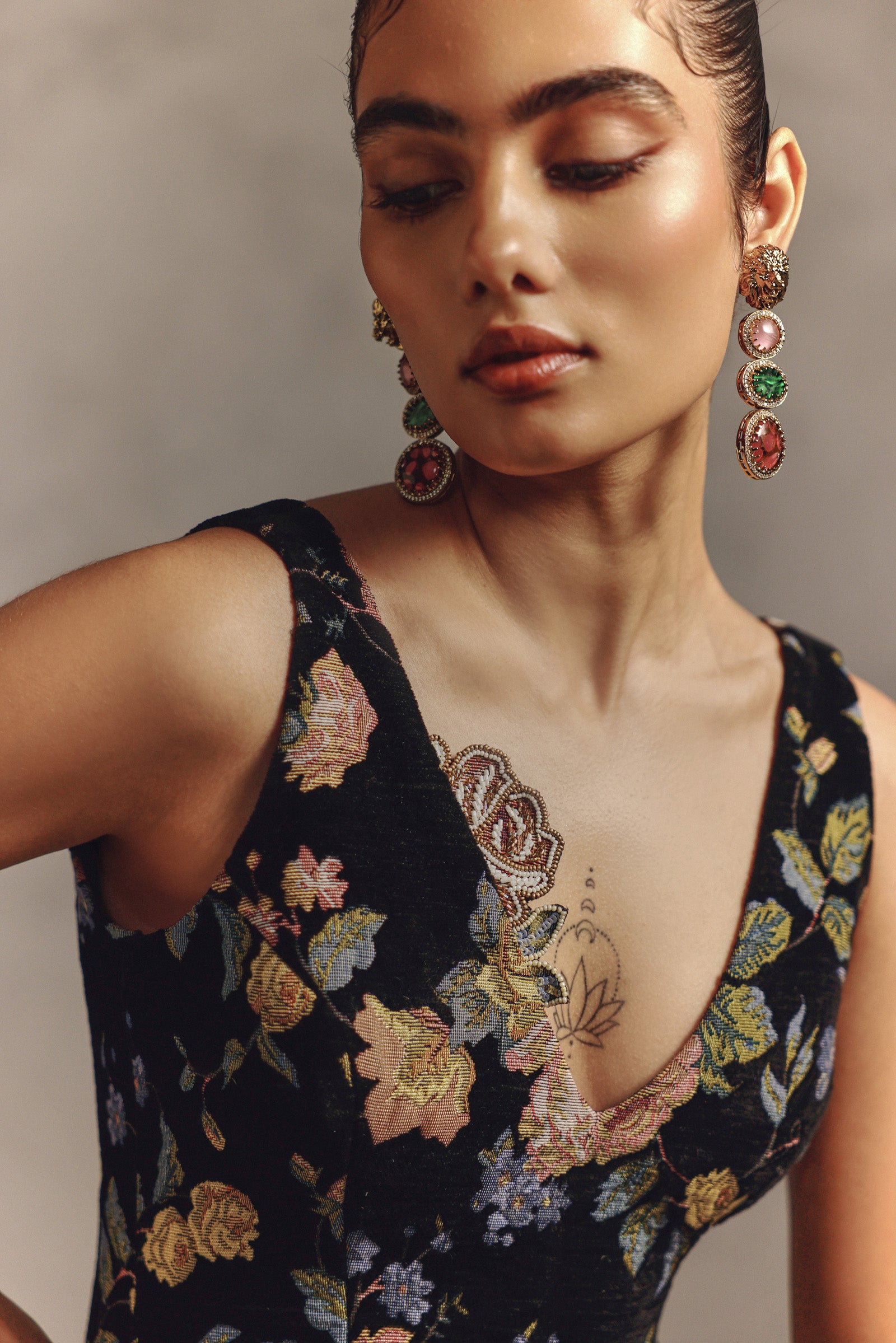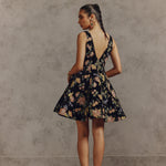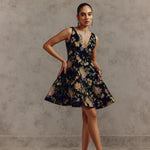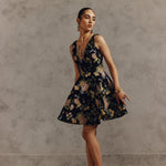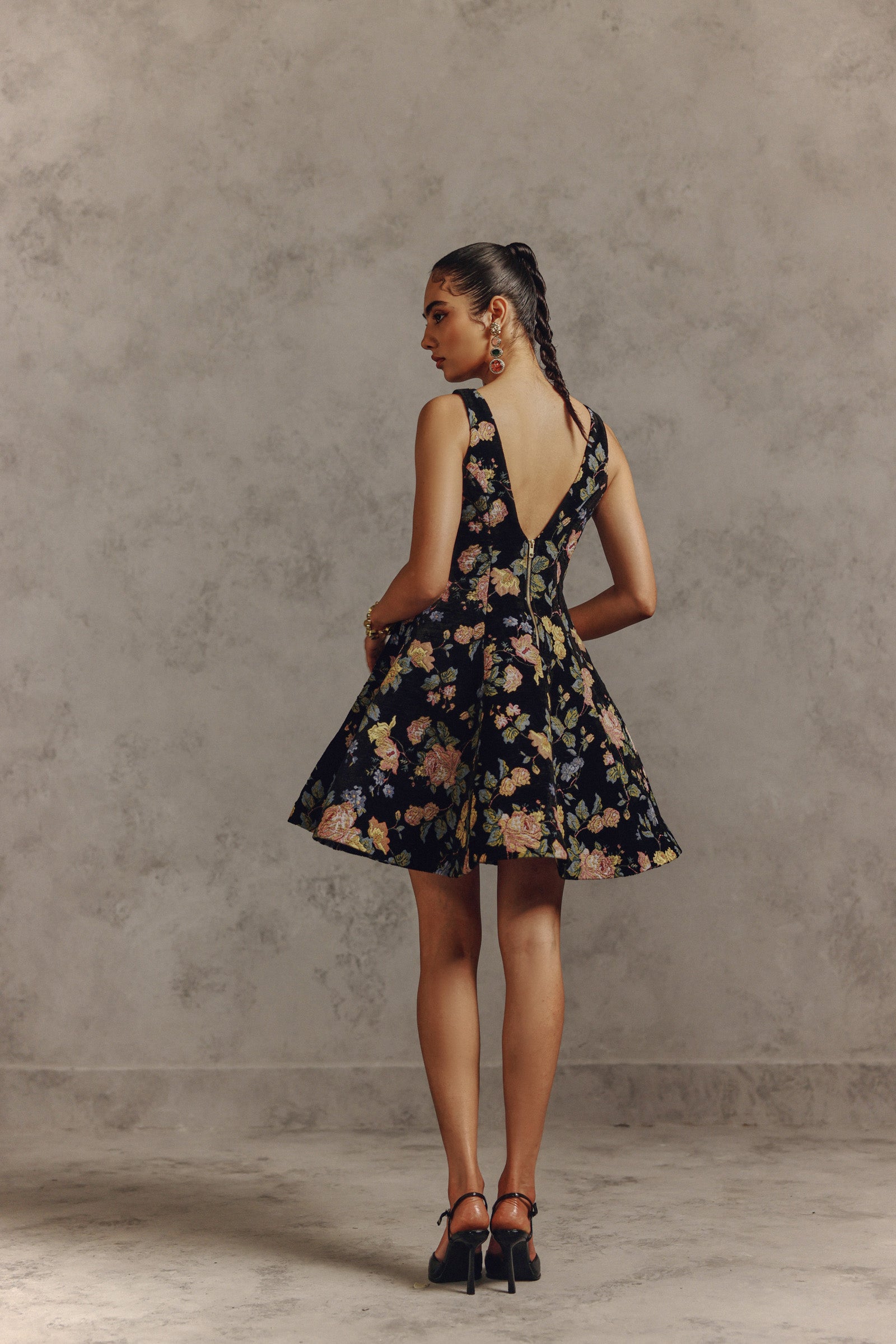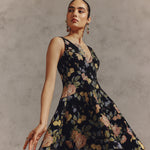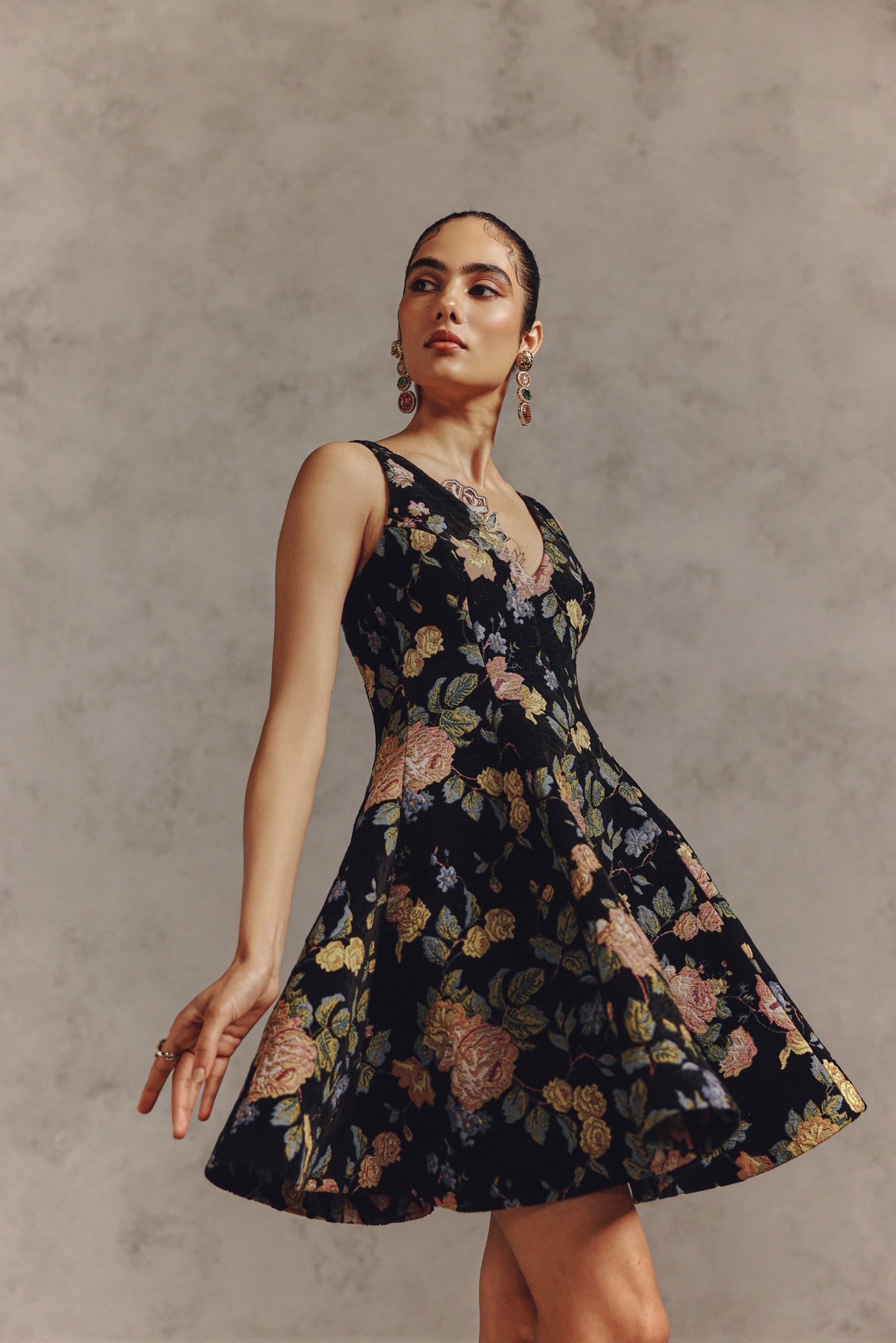 A black dress with intricate hand embroidered florals that weave elegance into every curve. The deep V neckline adds a touch of allure, while the soft cut sleeves balance femininity with modern touch. A striking silhouette perfect for evening moments with a hint of mystery.