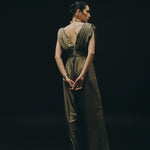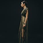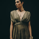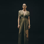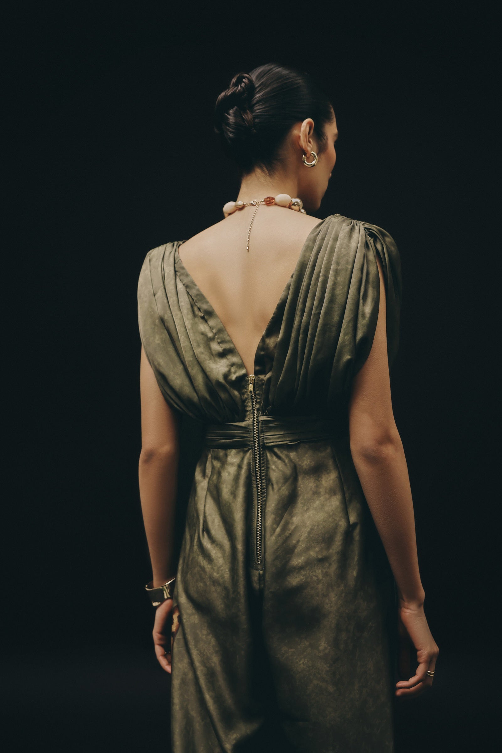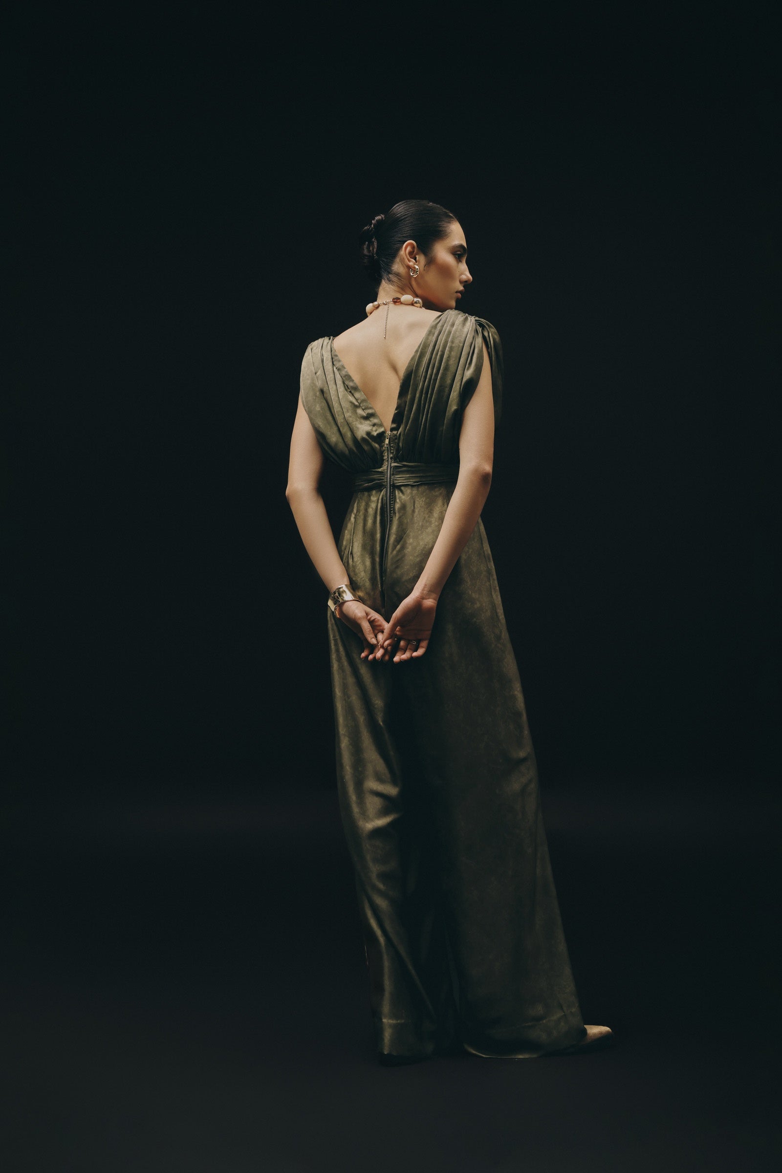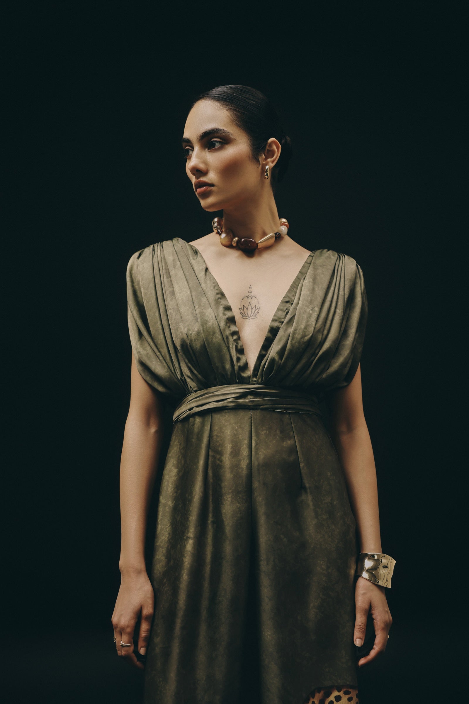 This is an elegant olive-toned jumpsuit which features a draped, deep V-neckline and broad, gathered shoulders. The outfit cinches at the waist with a tie belt, leading to dramatic wide-leg trousers. A unique leopard spot hand embroidery is prominently placed on the side of one pant leg.