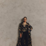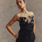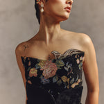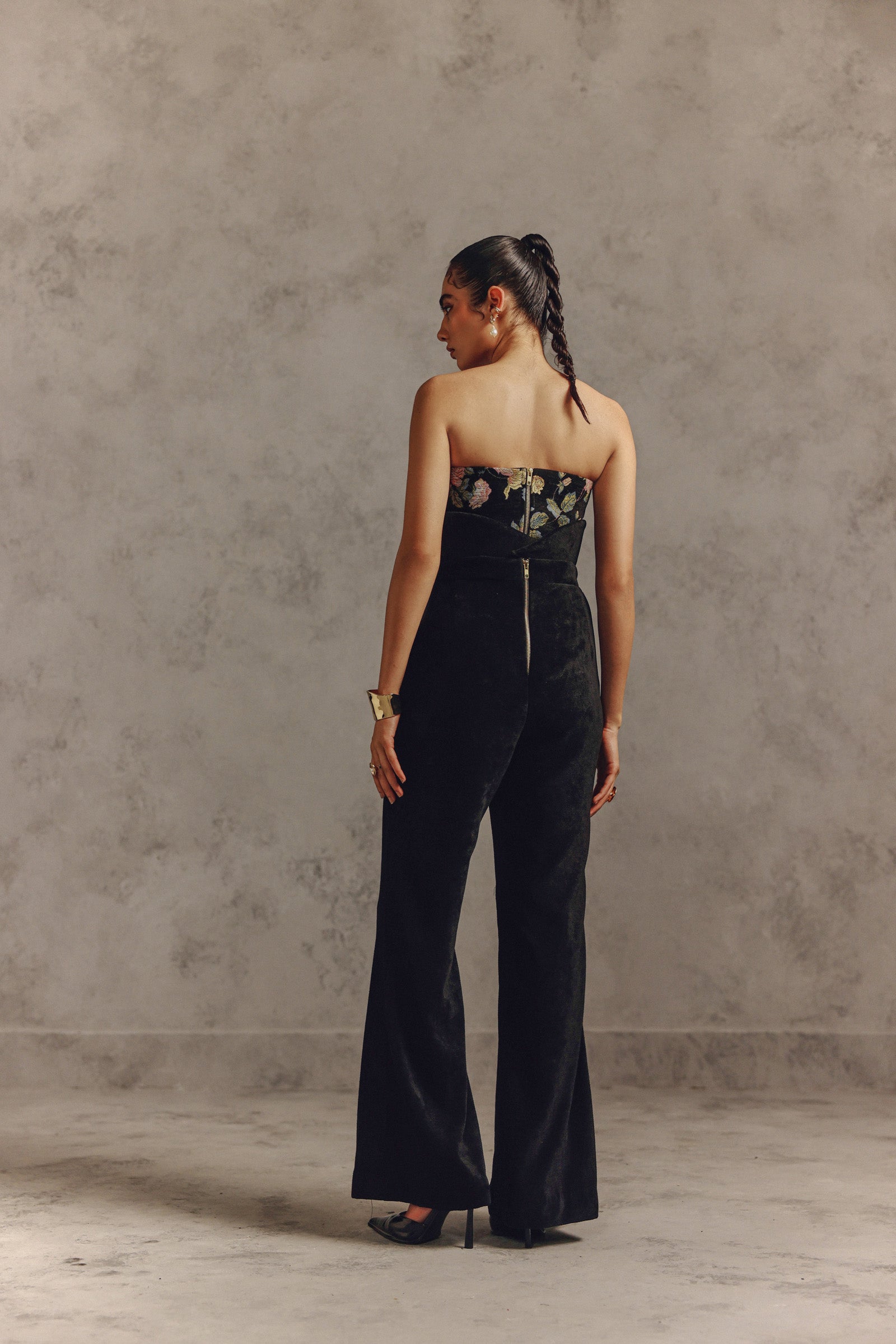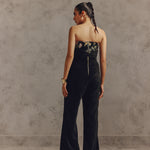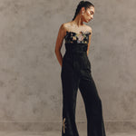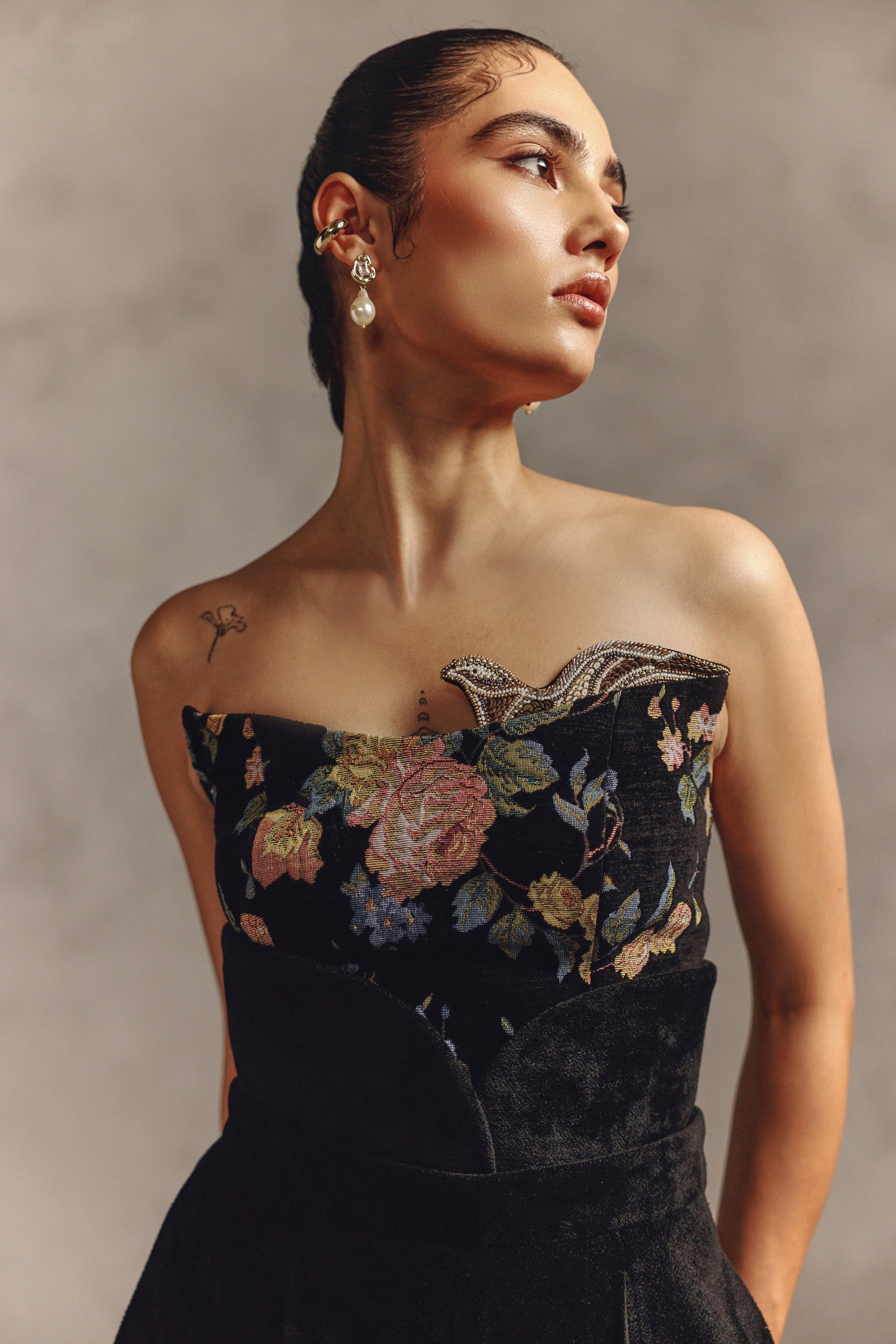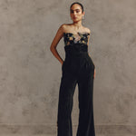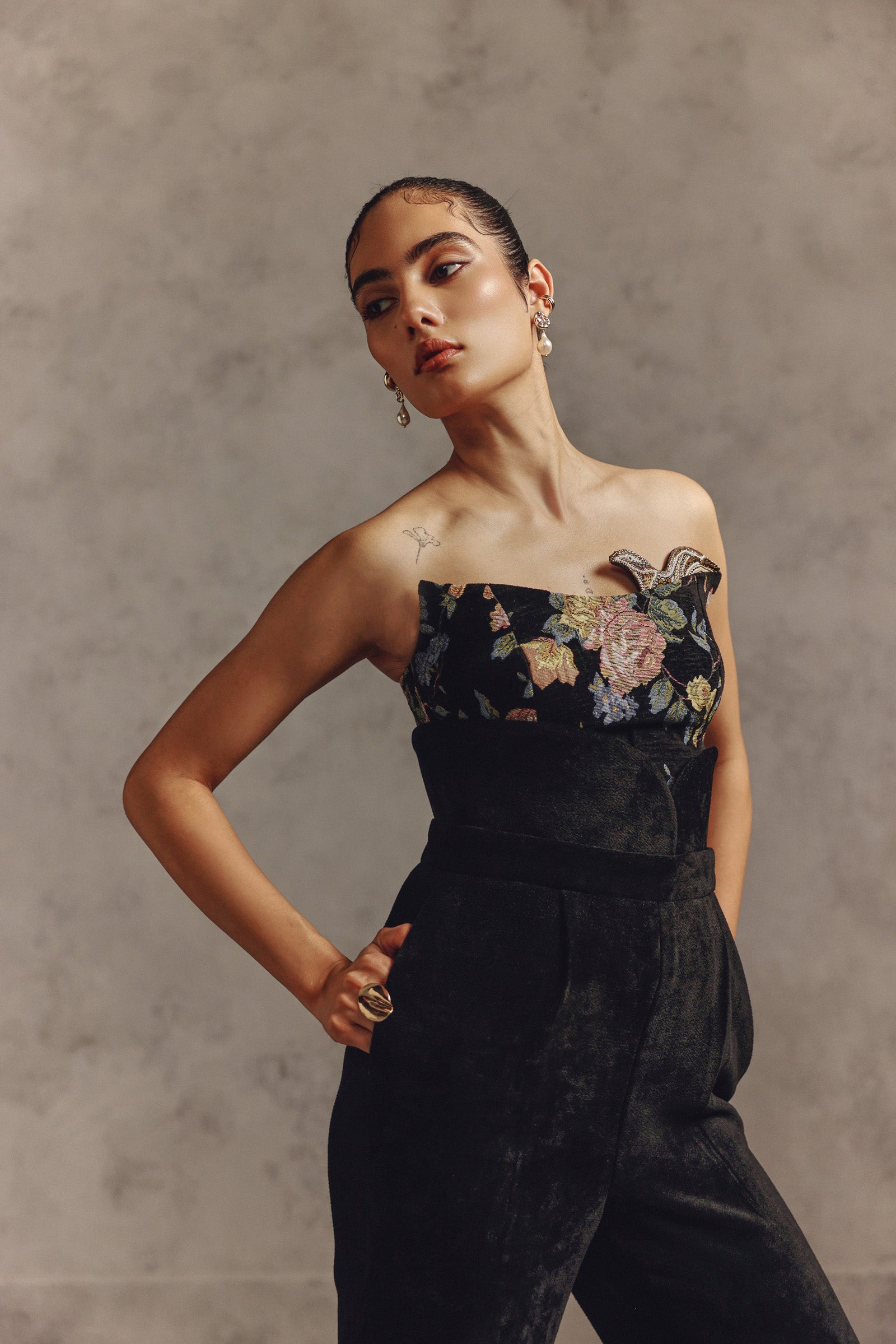 The co-ord features a sculpted tube top embellished with detailed pastel floral embroidery. The high-waisted black pants create an elongated silhouette, while the understated palette puts the floral detail into the spotlight. Sophisticated yet fresh, this ensemble pairs classic tailoring with romantic detailing for a look that feels both timeless and bold.