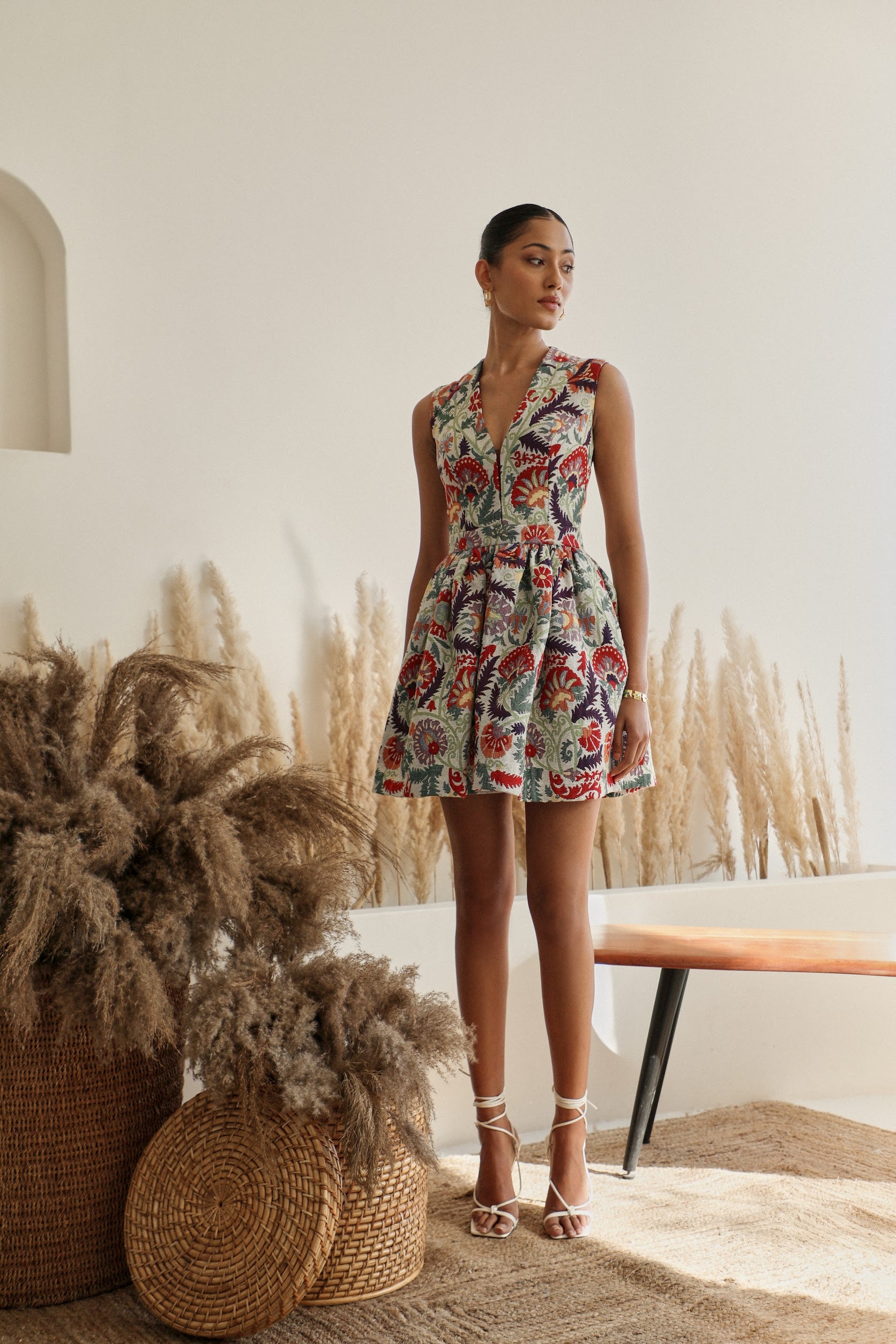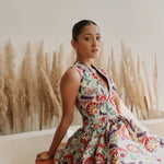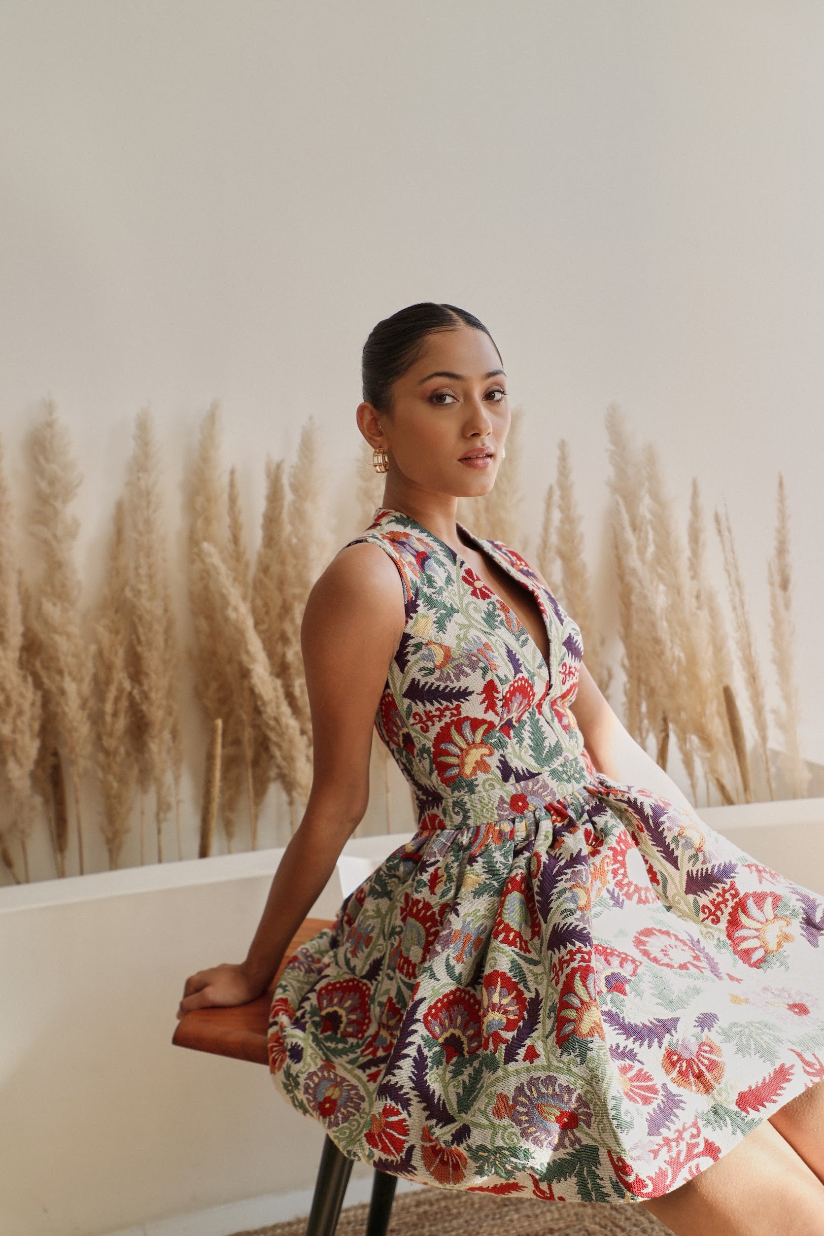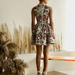 A quintessential short and sheer floral dress, with an elegant and edgy V-neck. Ella is pretty in floral and flowy for a dinner date by the sea, or a resort staycation.