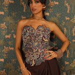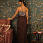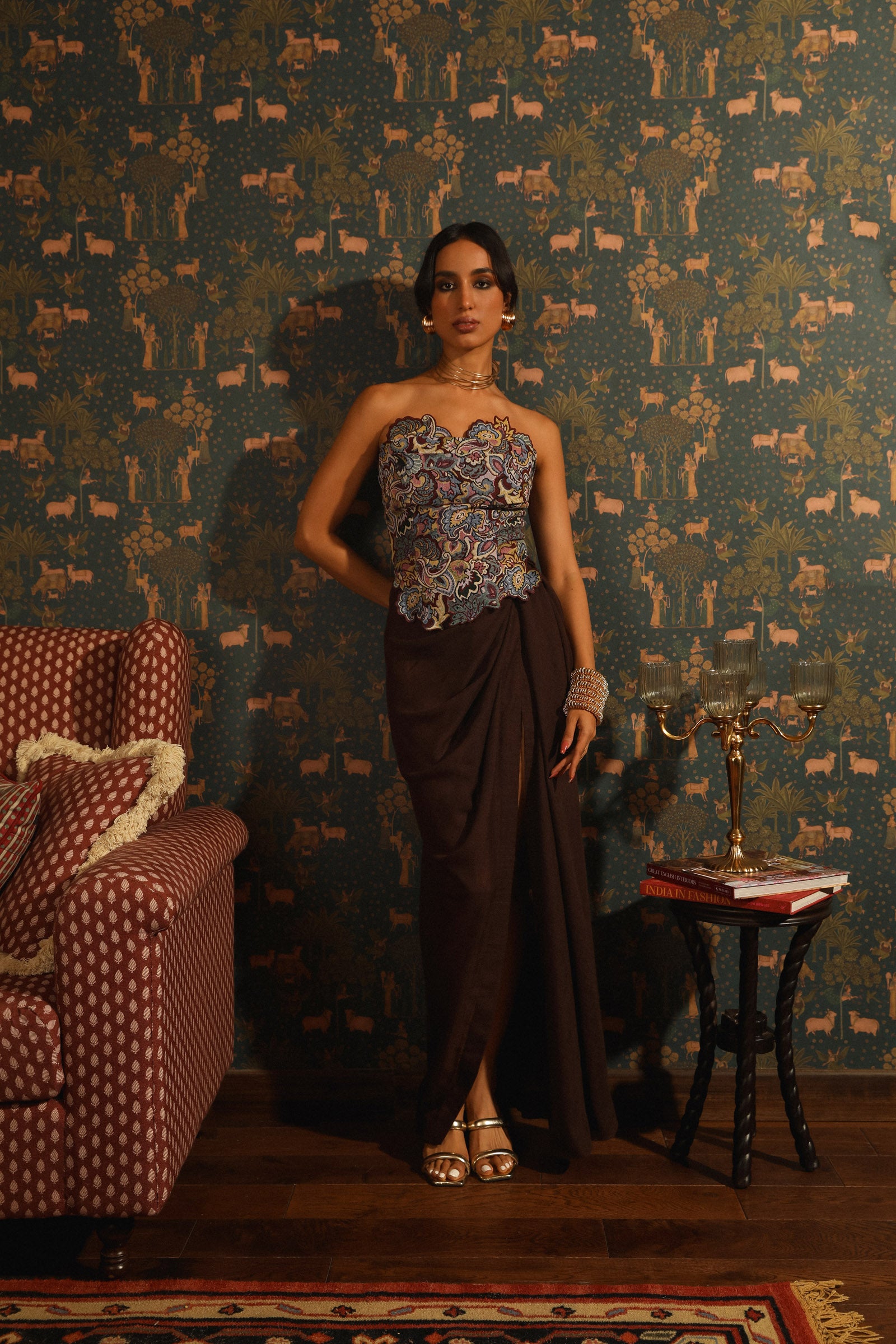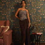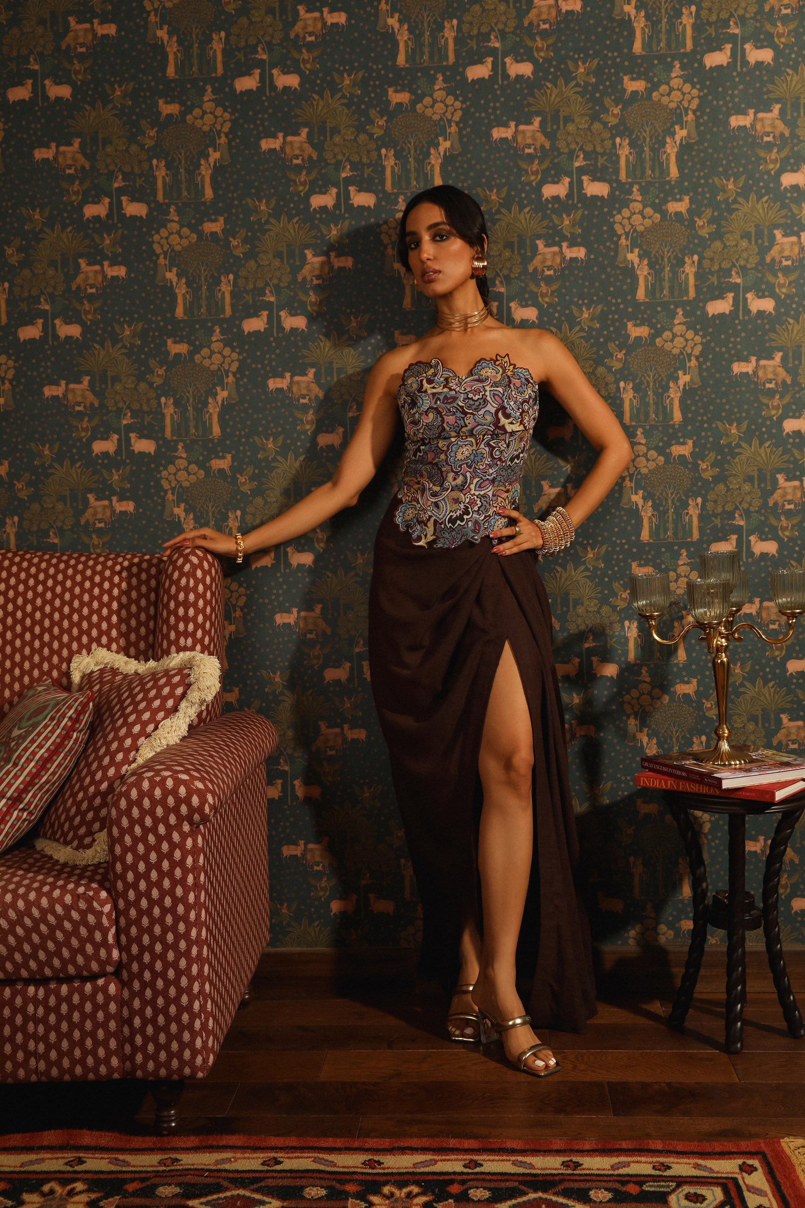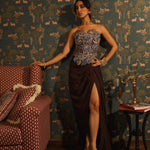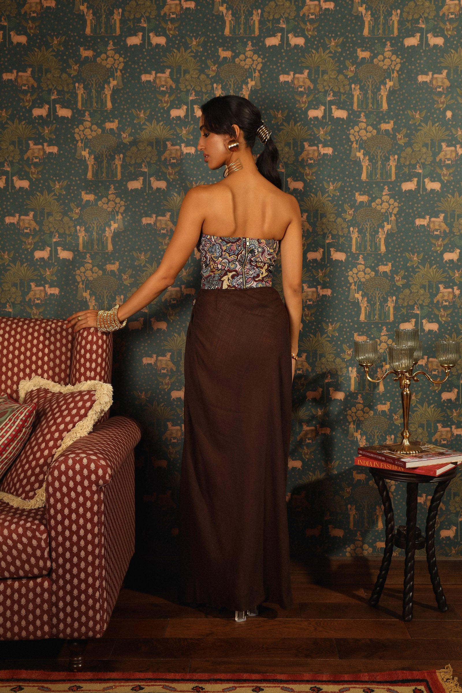 This skirt set includes a sleek brown gathered slit skirt and a bold strapless top, creating a stunning, cohesive look. Perfect for all your refined occasions, the ensemble offers a sophisticated sheath effect with a blend of chic elegance and striking style.